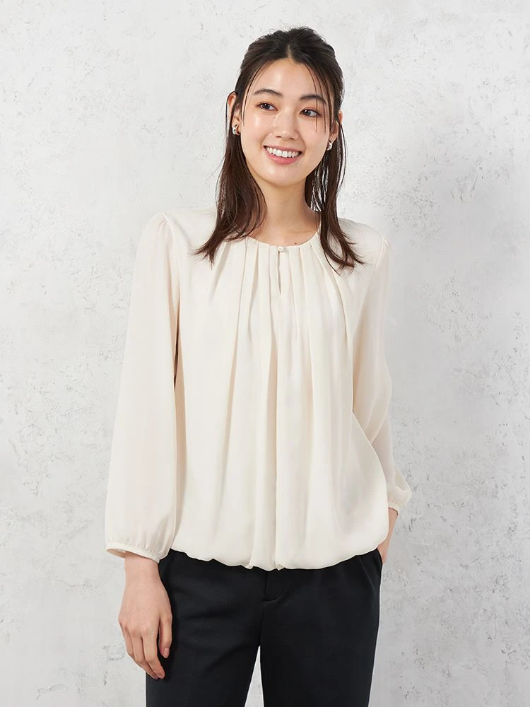 くしゅっとシボ感のあるジョーゼット素材で仕上げたこれからの季節にぴったりなブラウス。