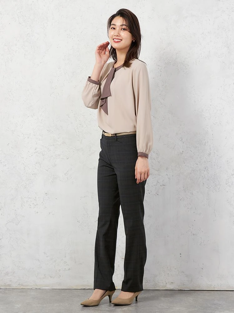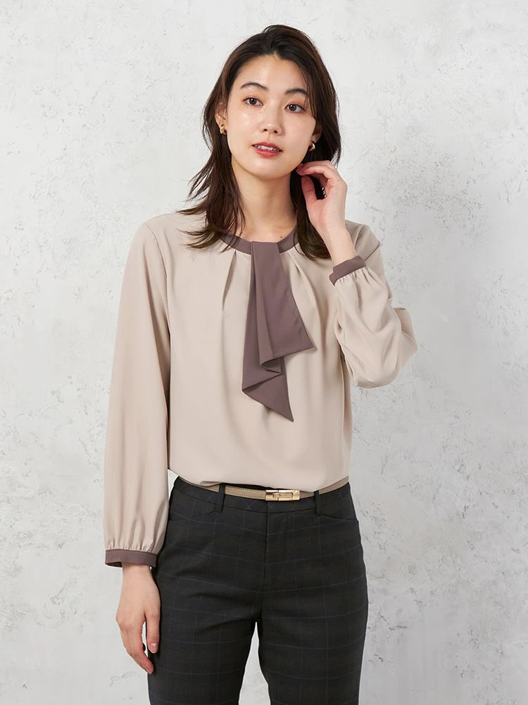 【ストレッチ】ラチネ織 配色ボウタイ 2WAYブラウス 9分袖 ウォッシャブル SOFFICE 通年【レディース】(ベージュ)
