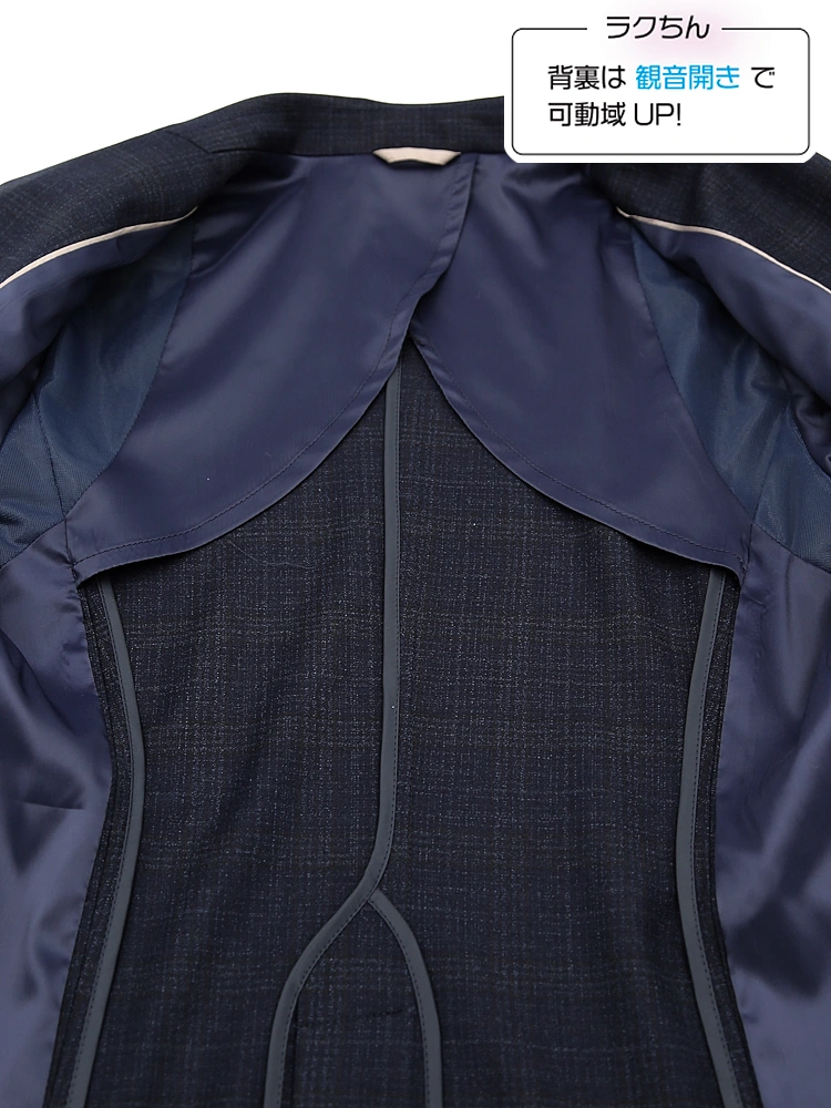 背裏は観音開きで可動域をアップ。肩~袖回りが動きやすく、抜群の着心地でストレスフリーに過ごせます。