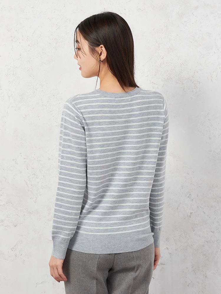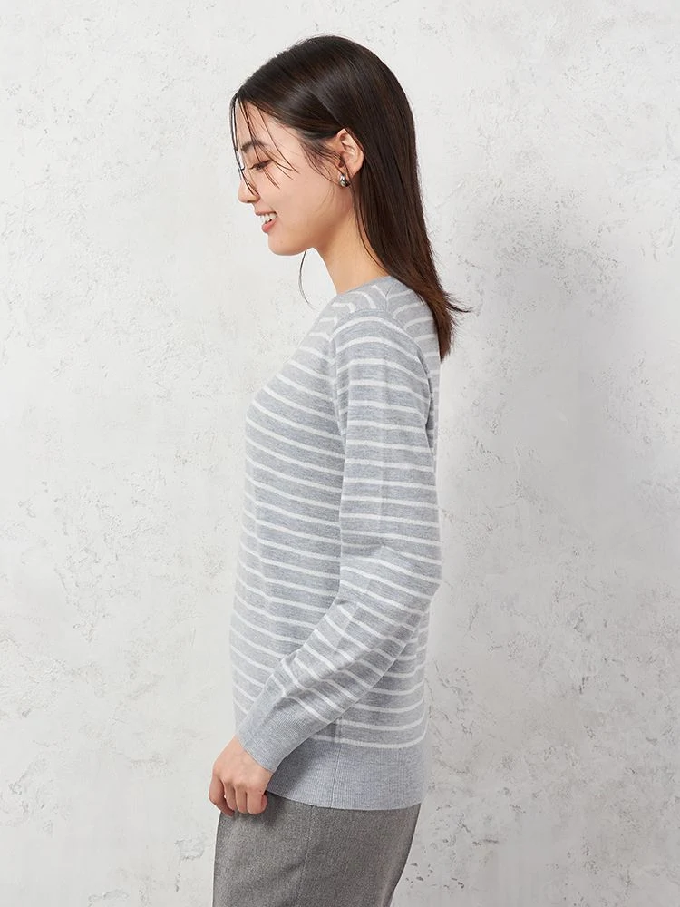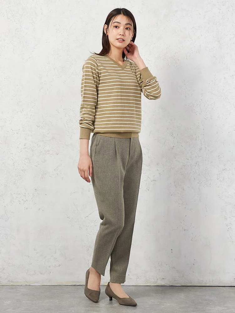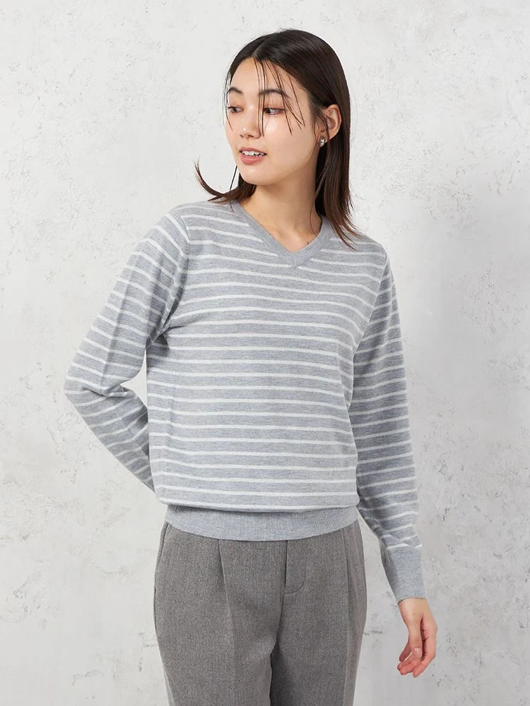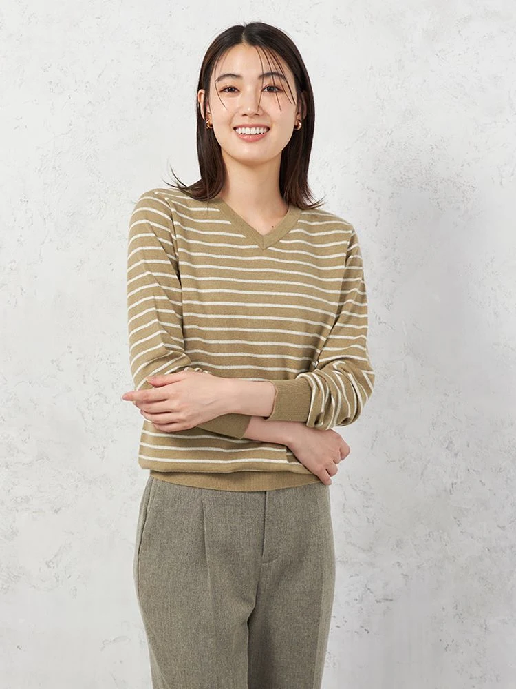 【INDIVI】Vネックプルオーバーニット ウォッシャブル デオドラント ボーダー 秋冬【レディース】(ベージュ)