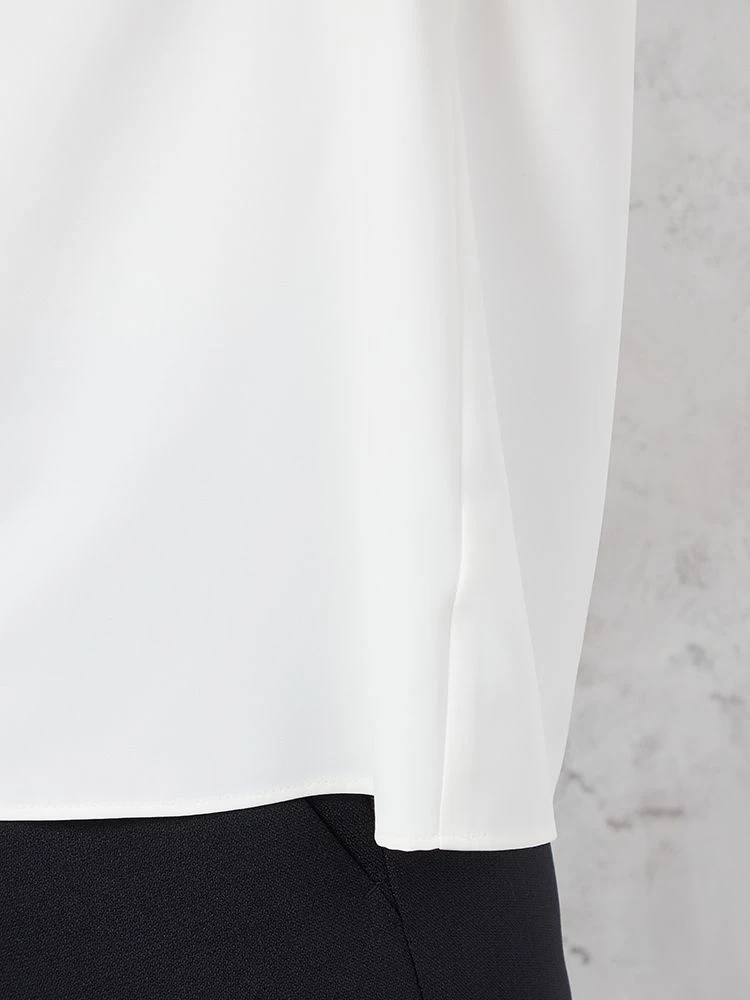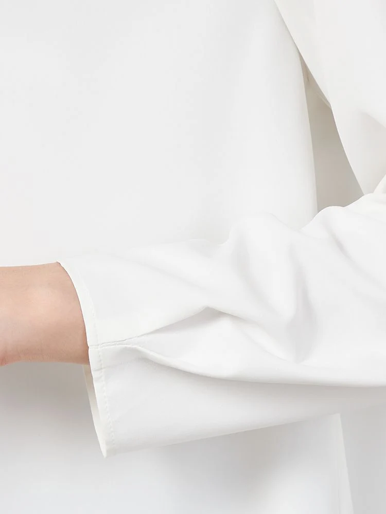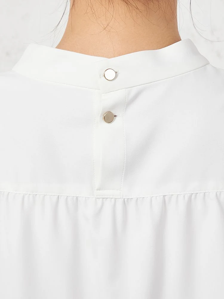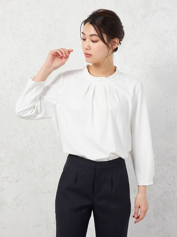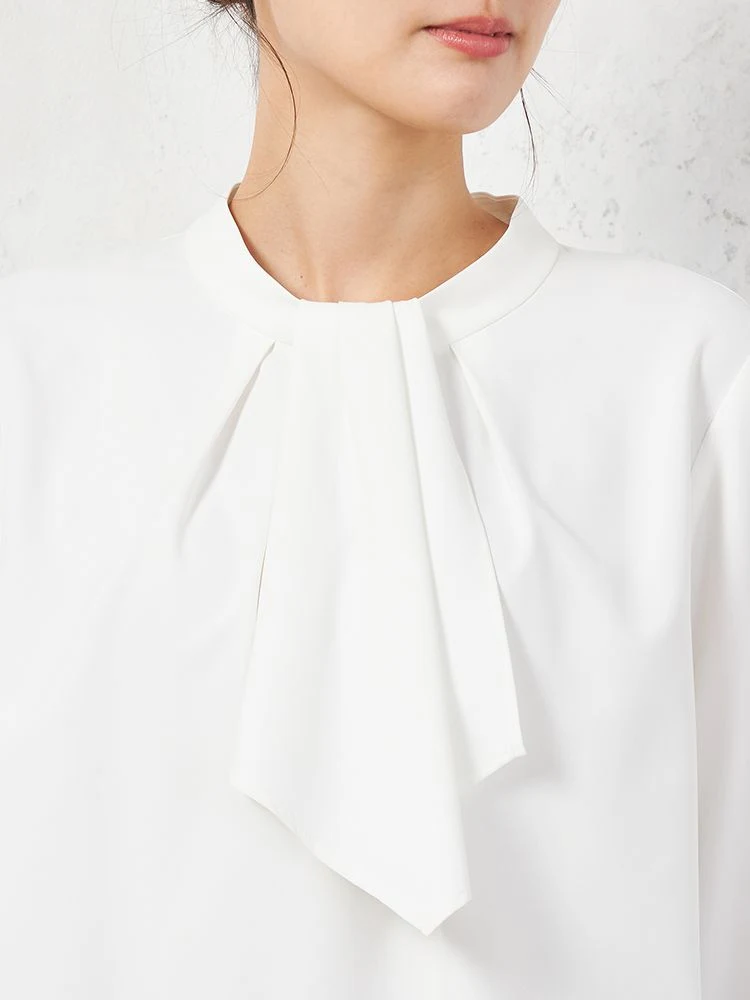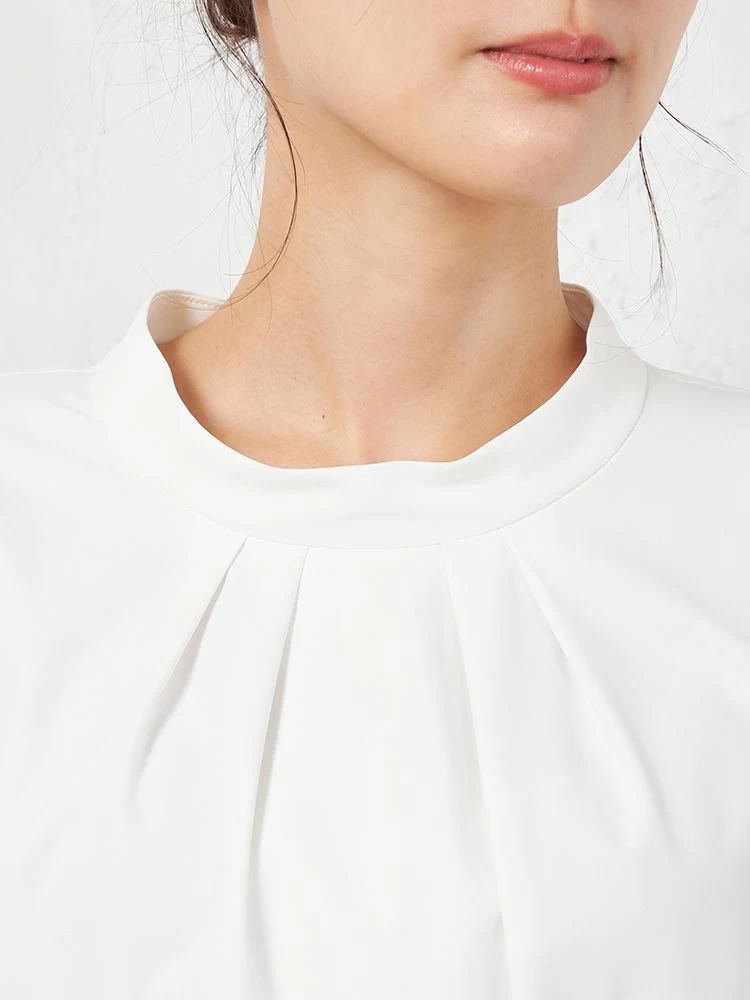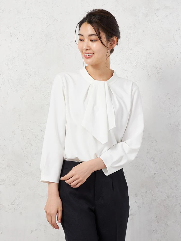 ボウタイはタイを内側にいれるとシンプルなスタンドカラーになる2WAY仕様、後ろギャザーやメタルボタンでバックもおしゃれに決まります。