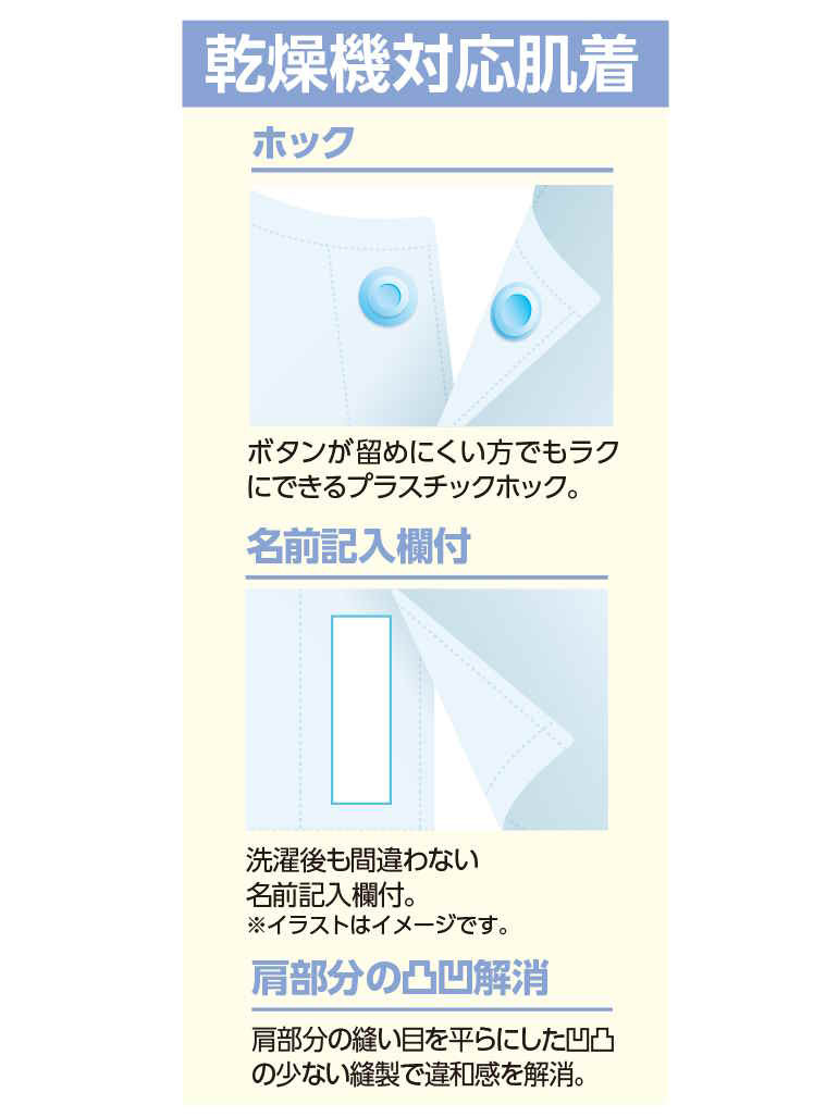 乾燥機対応肌着。ボタンが留めにくい方でもラクにできるプラスチックホック。