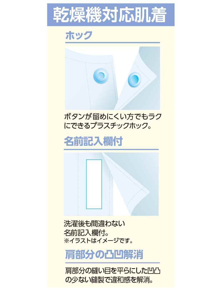 乾燥機対応肌着。ボタンが留めにくい方でもラクにできるプラスチックホック