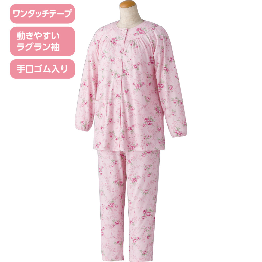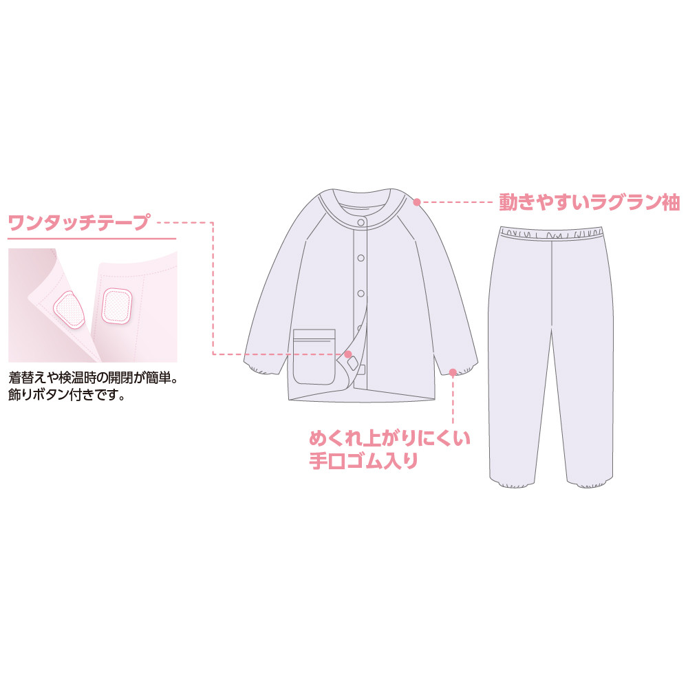 着替えや検温時の開閉が簡単。飾りボタン付で見た目は普通のパジャマです。