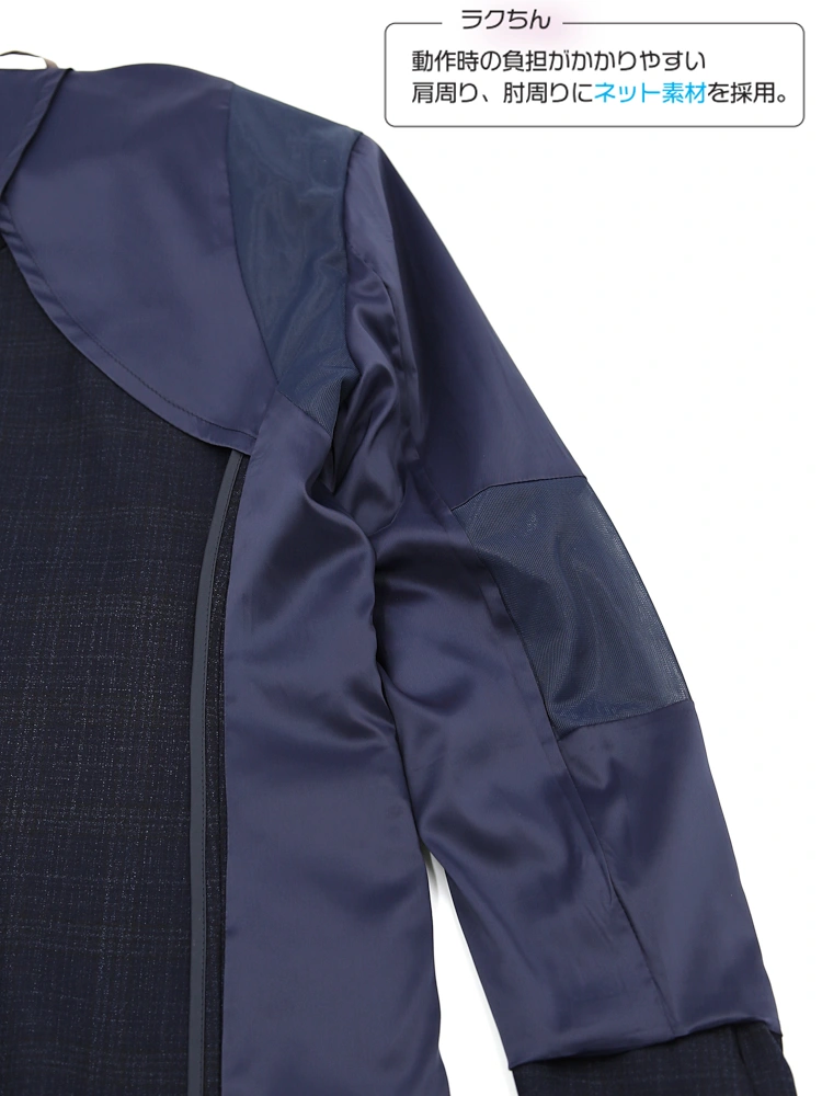 表地ストレッチ素材に加え、肩周りと肘回りにも伸縮性のあるトリコット裏地を使用。
