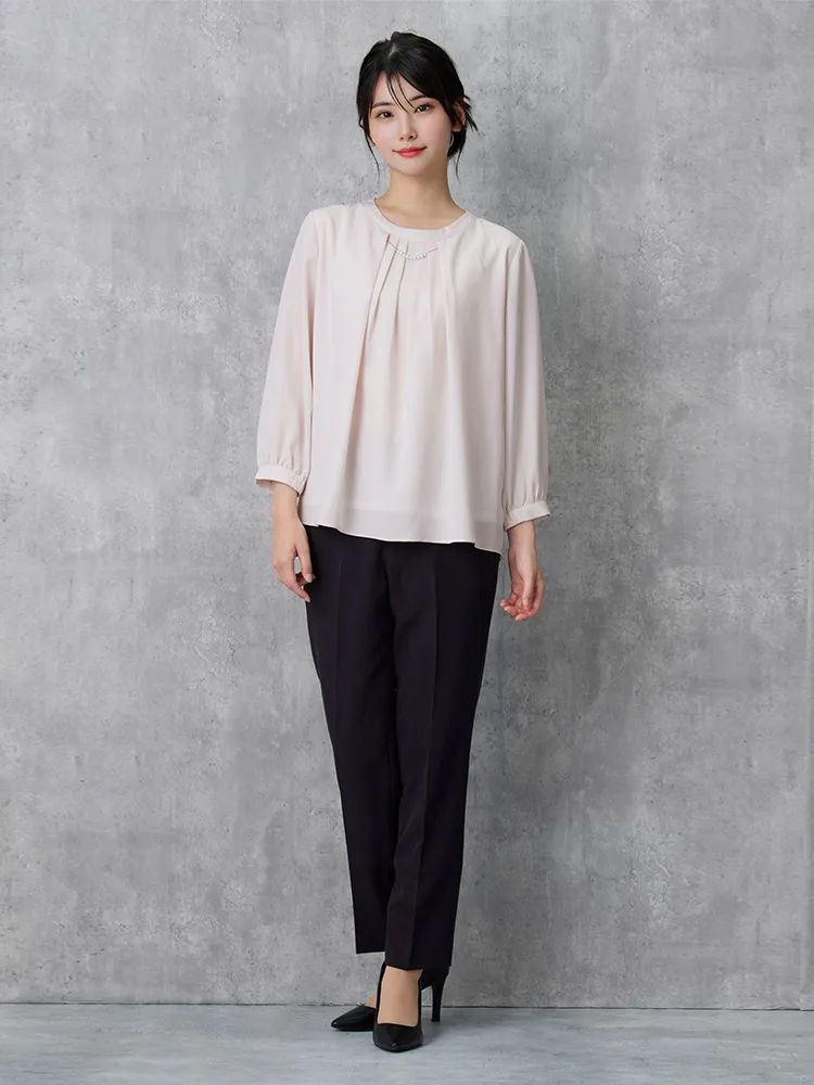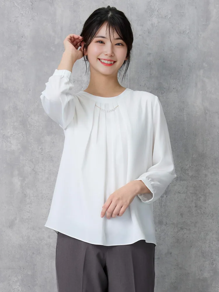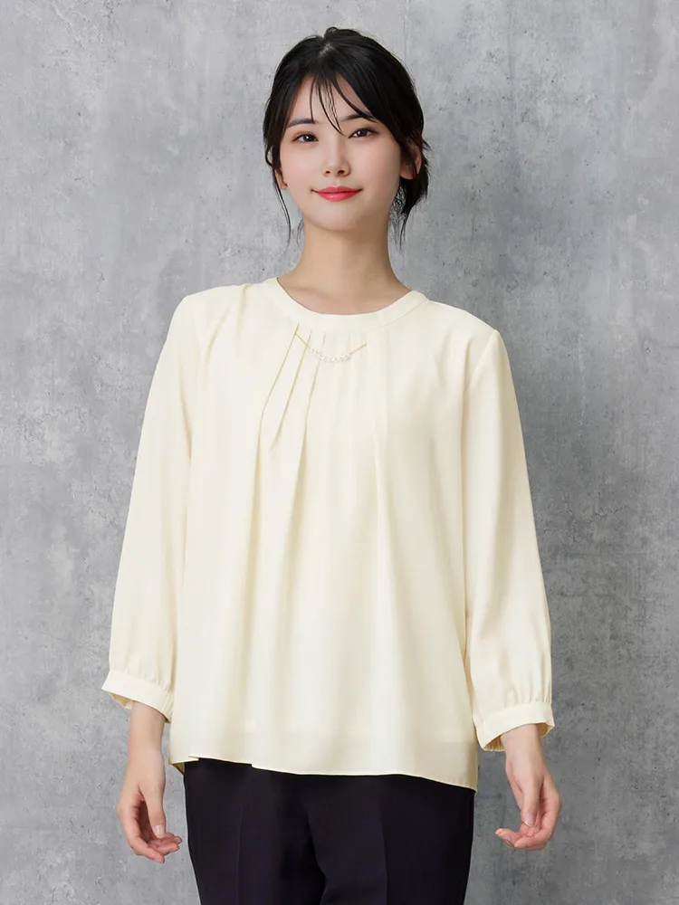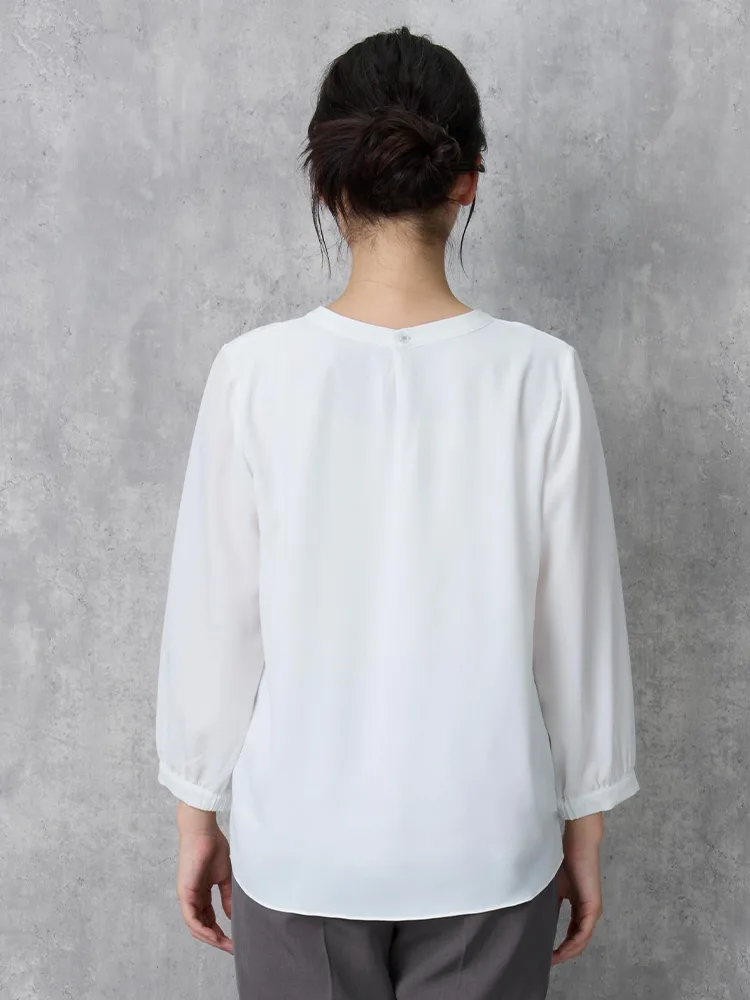 エレガントなデザインとカラーで幅広いシーンで活躍できる7分袖ブラウス。