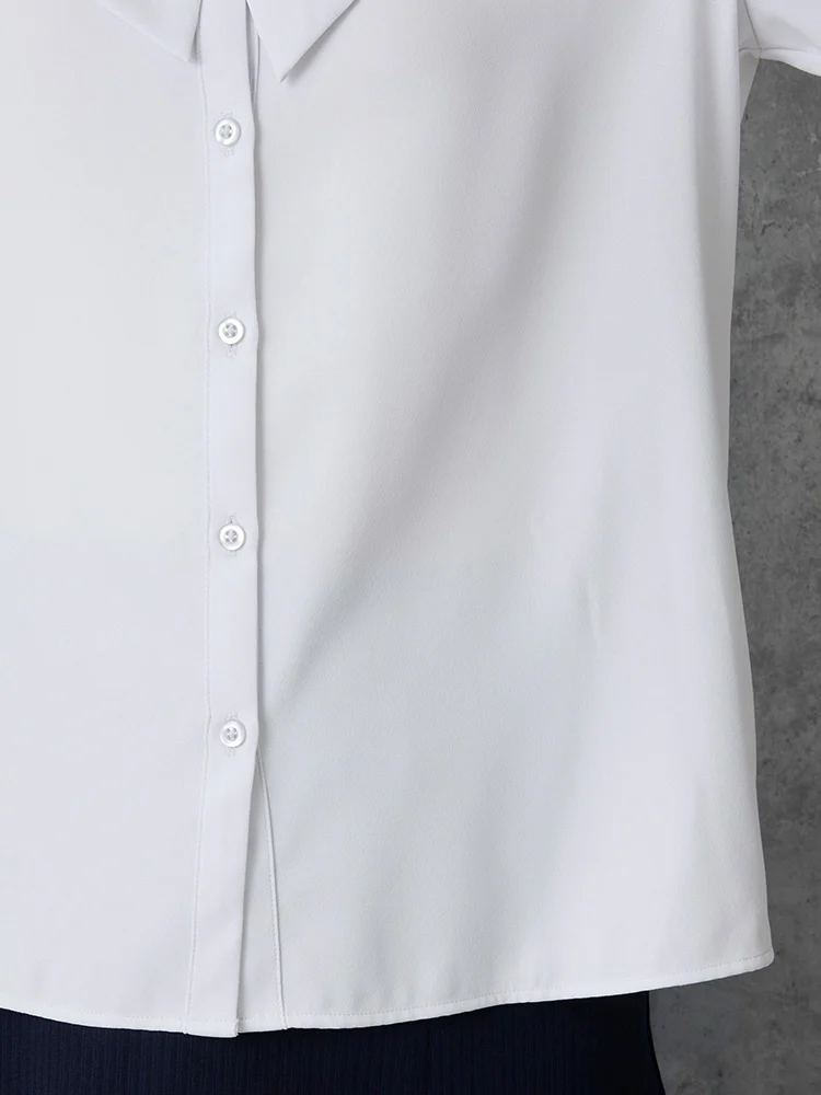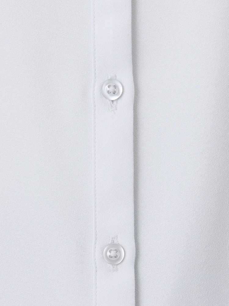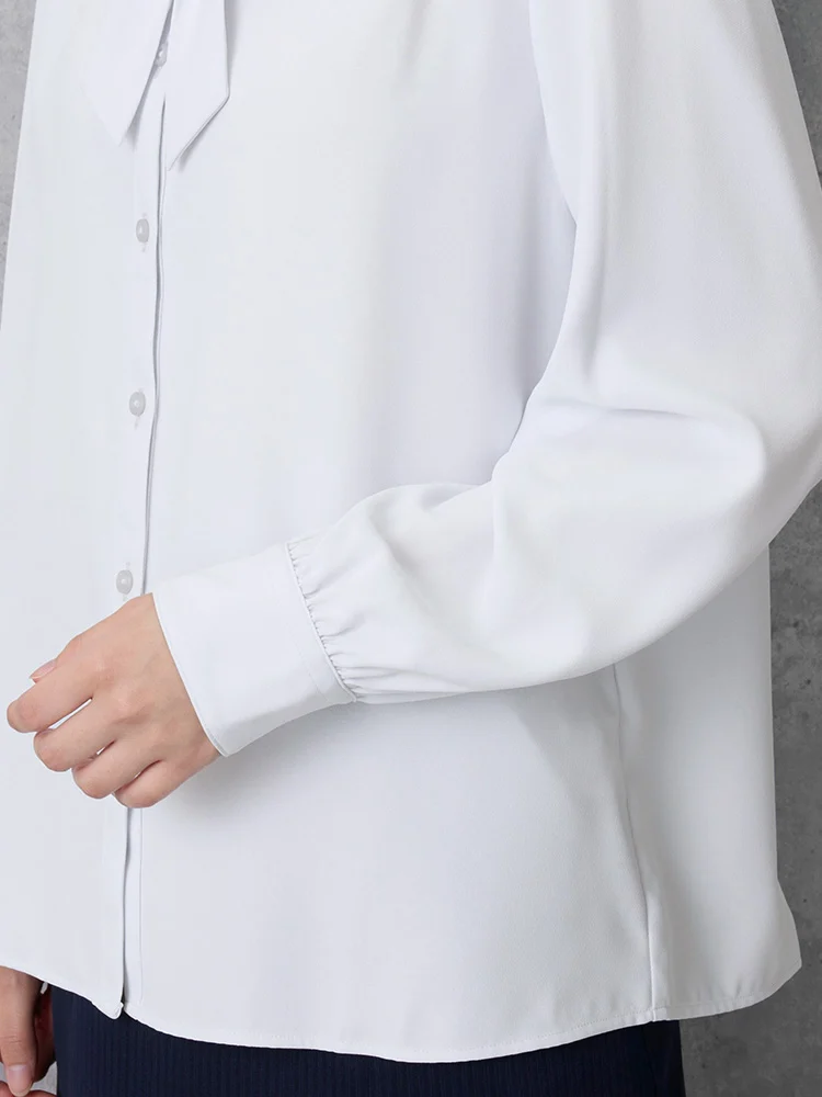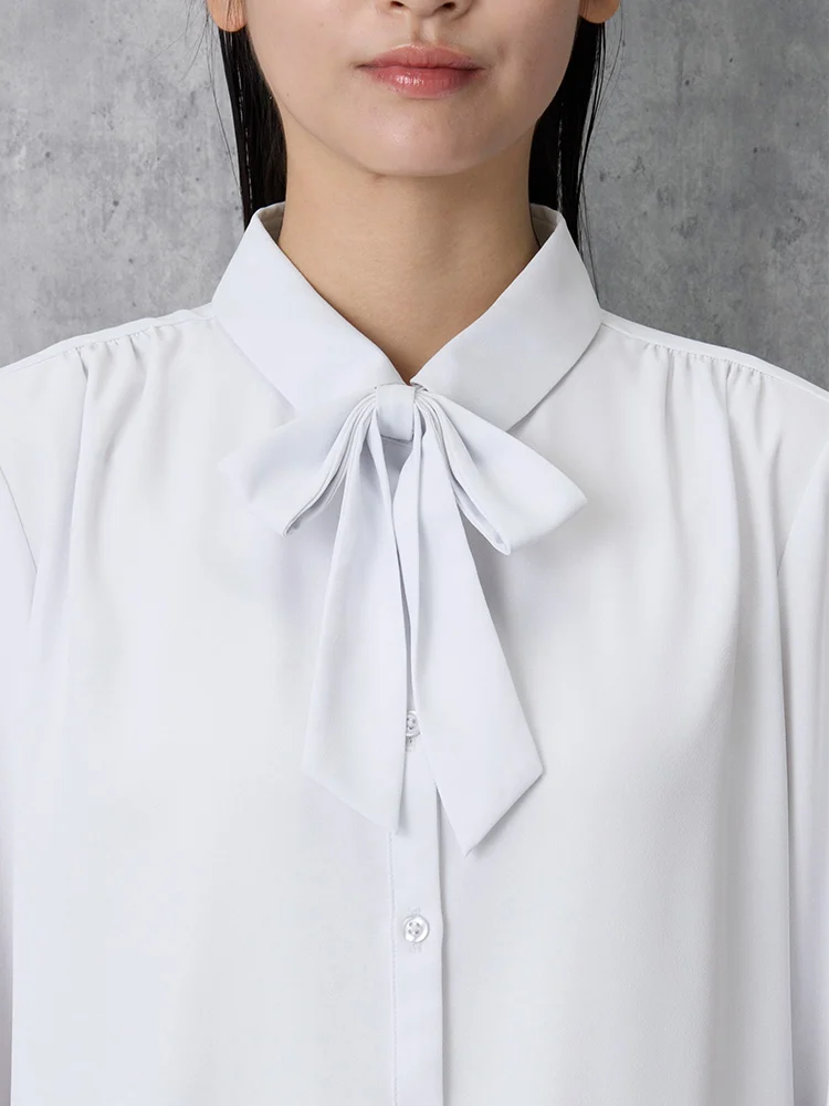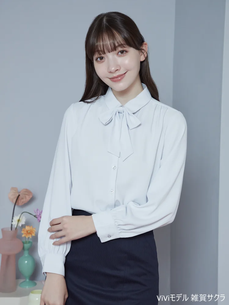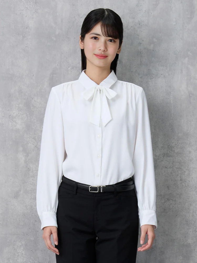 取り外し可能なリボン付きで、気分やコーディネイトによって2通りの着こなしが楽しめるレギュラーブラウス。