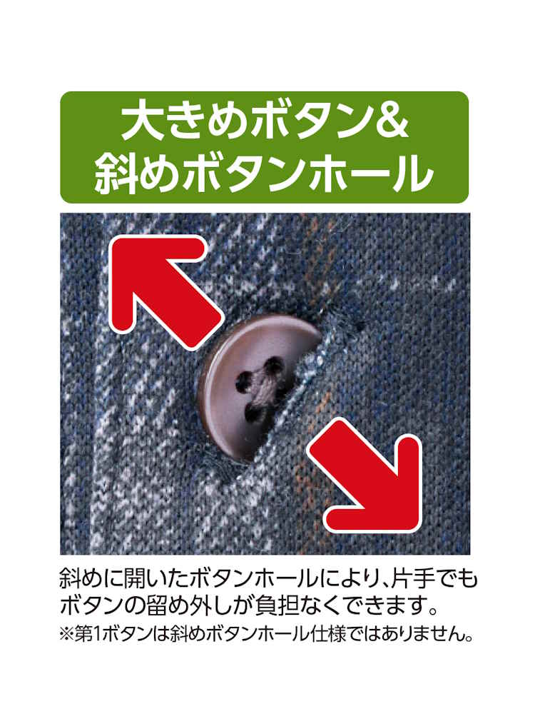 斜めに開いたボタンホールにより、片手でもボタンの留め外しが負担なくできます。