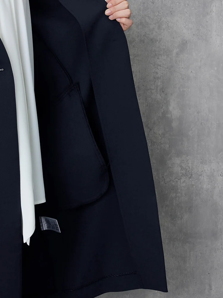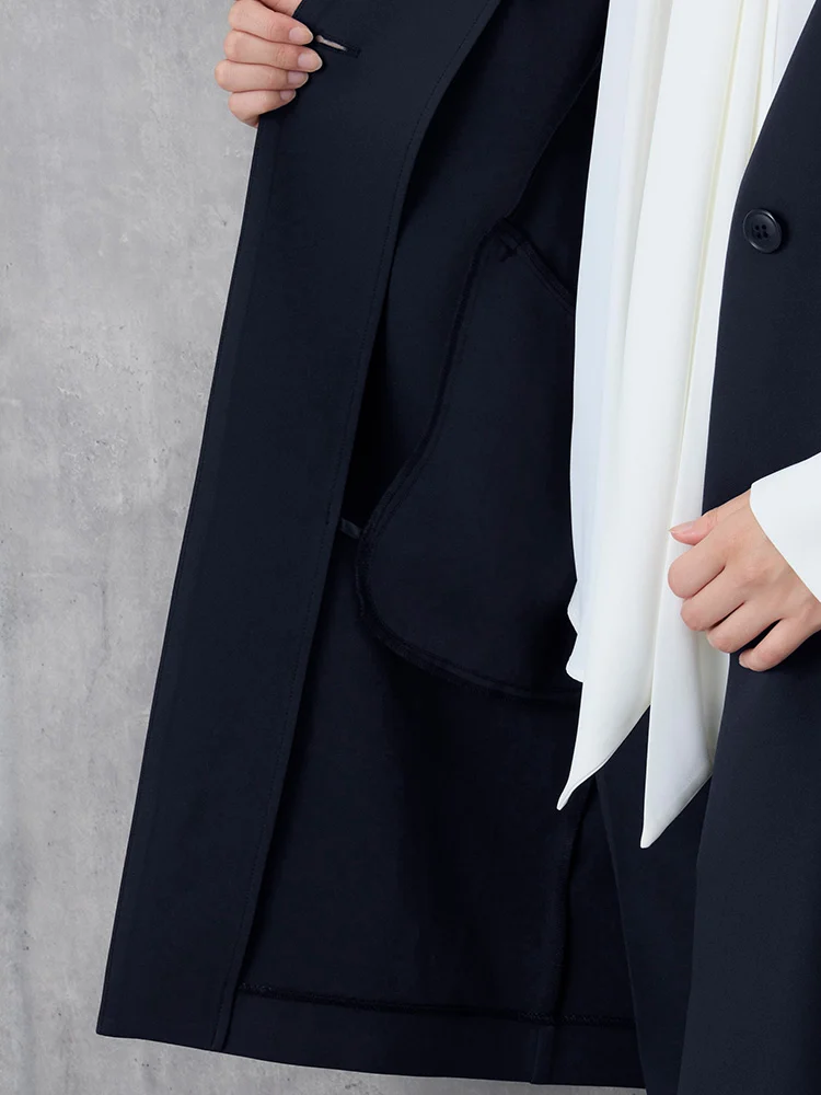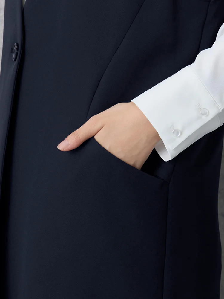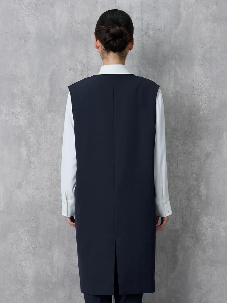 通年着用できるしっかりとした肉感素材のジレとパンツは、程よく伸びる生地で長時間の着用でもストレスフリーな着心地です。