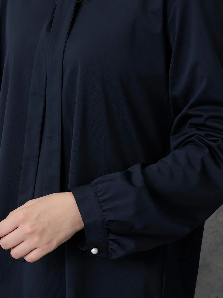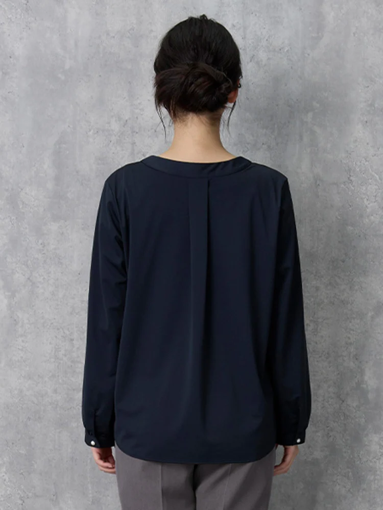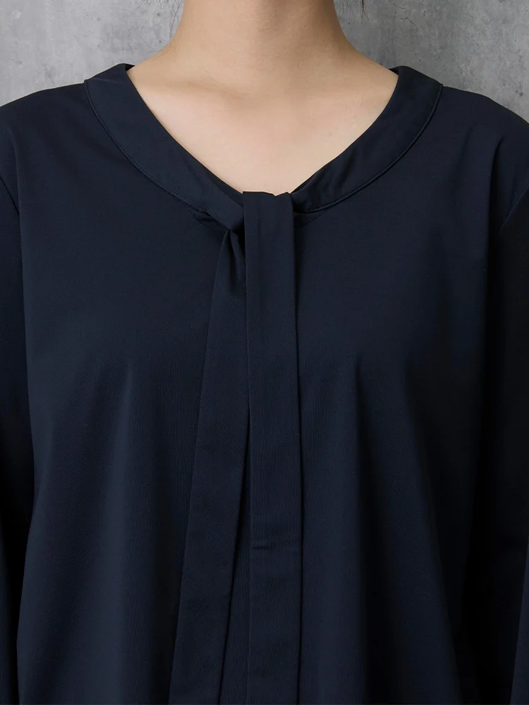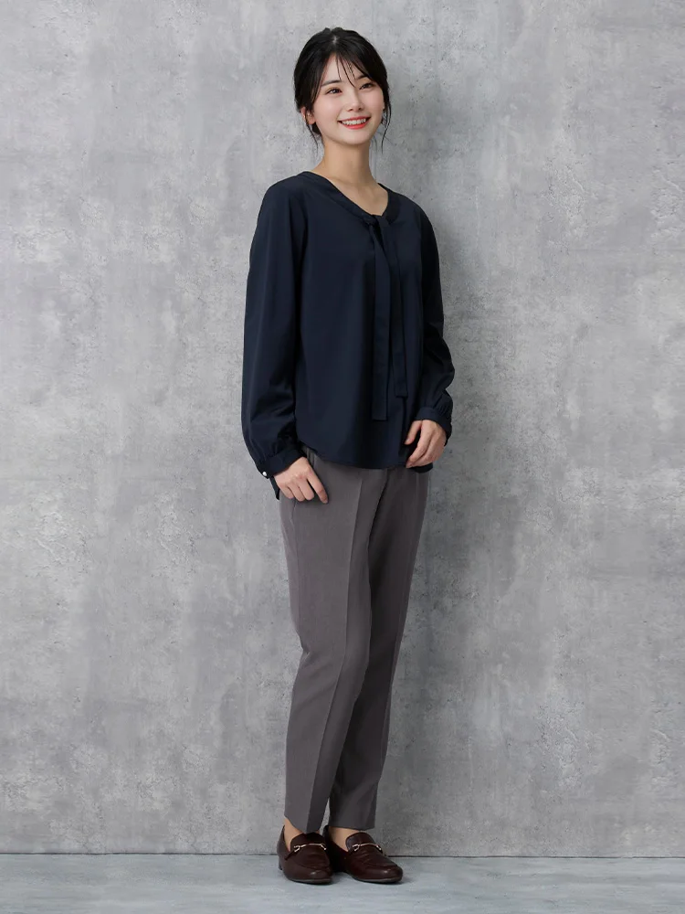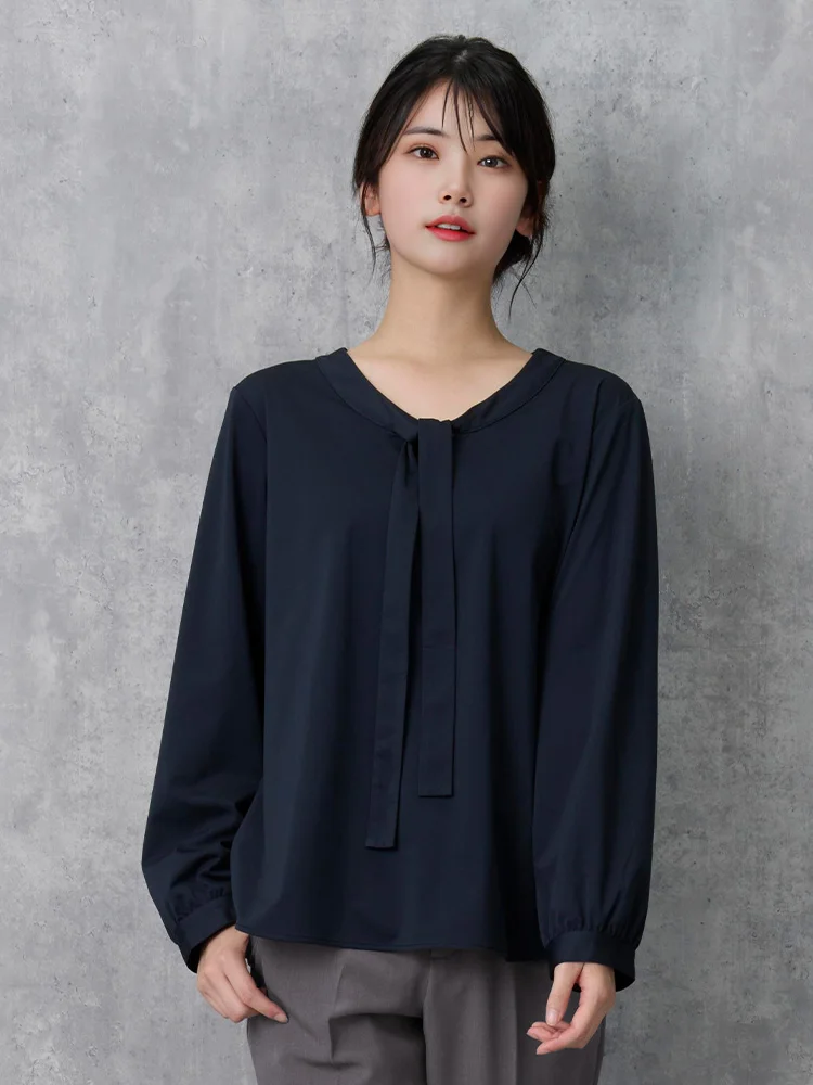 ストレッチ性抜群のハイゲージトリコットニット素材を使用した長袖ボウタイブラウス。