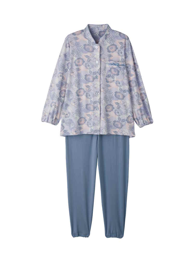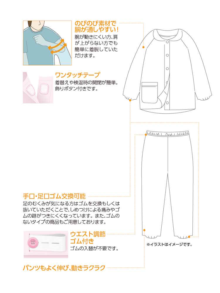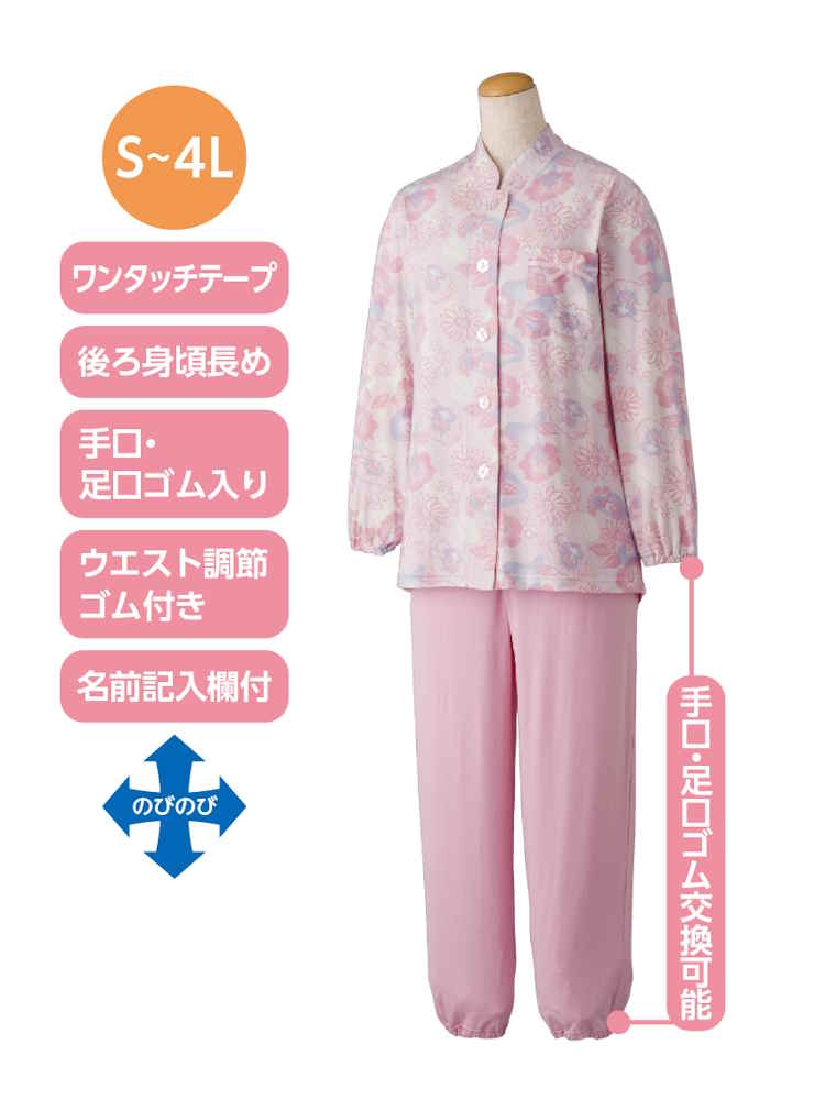 【年間素材】【前開き】ワンタッチのびのびストレッチパジャマ4 大きめサイズ/婦人用/レディース/高齢者/シニア/ストレッチ/着脱しやすい/後ろ長め/名前記入欄付/プレゼント/ギフト 【CF】(ピンク)