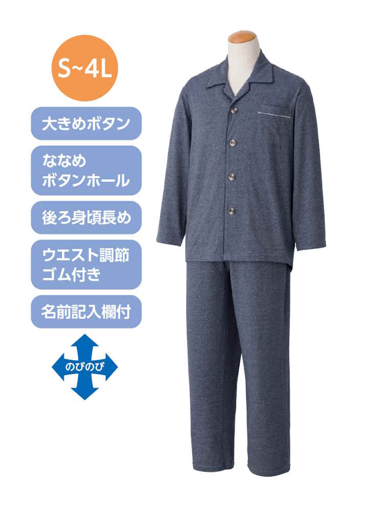 【前開き】【通年】大きめボタンのびのびストレッチパジャマ4/紳士用/メンズ/高齢者/シニア/名前記入欄付/後ろ長め/ななめボタンホール/プレゼント/ギフト 【CF】(ネイビー)