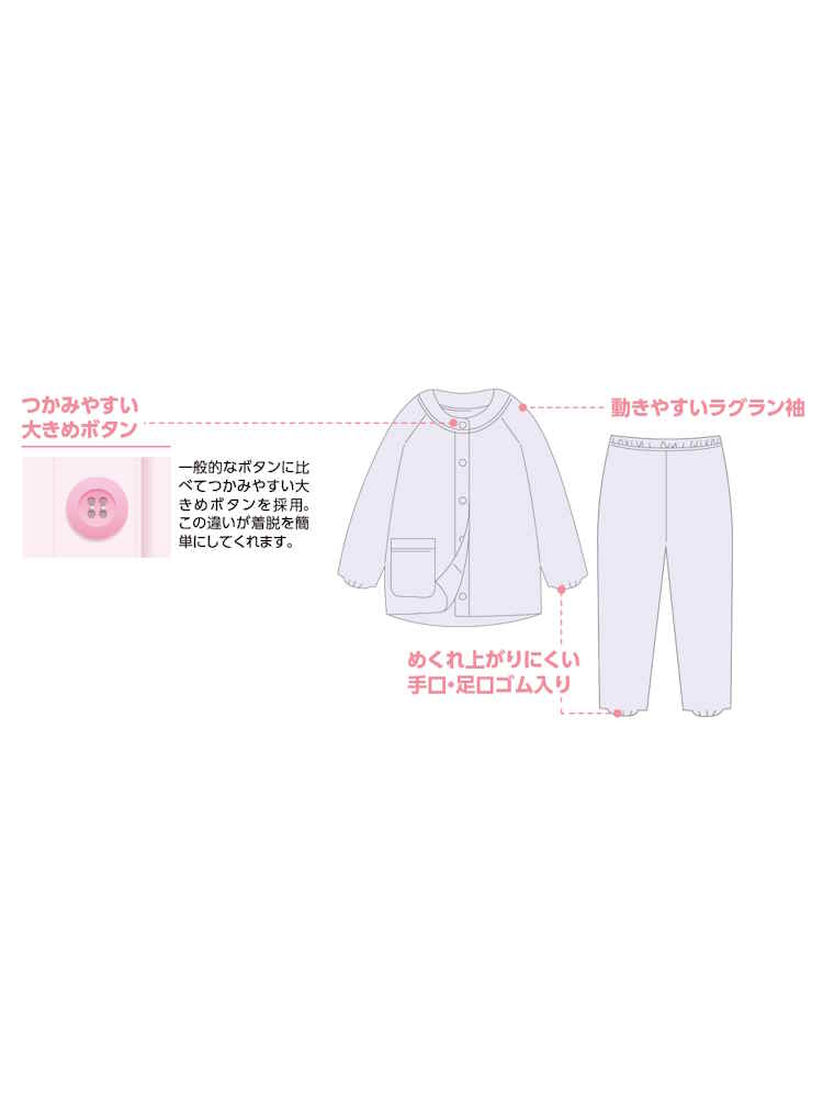 動きやすいラグラン袖。腕が上がりやすく、動かしやすいため、着脱が楽にできる安心設計です。