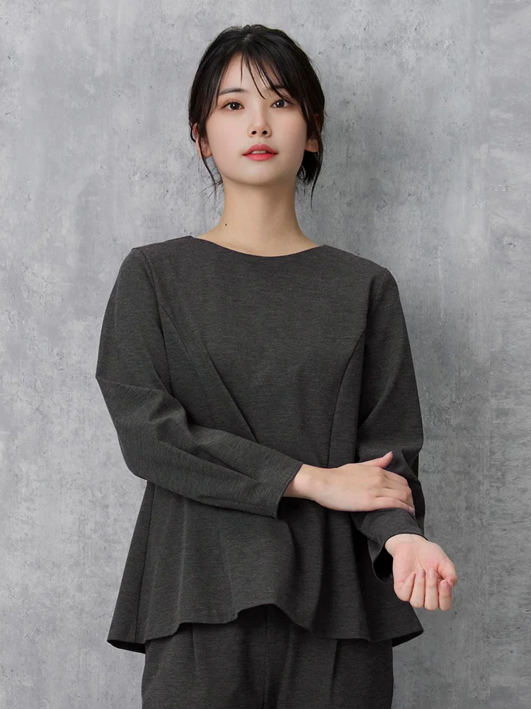 ウェストをやや絞り裾に向かって広がるペプラムブラウスです。