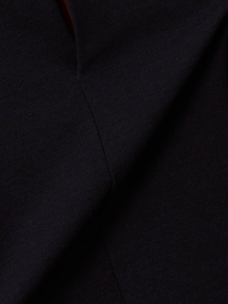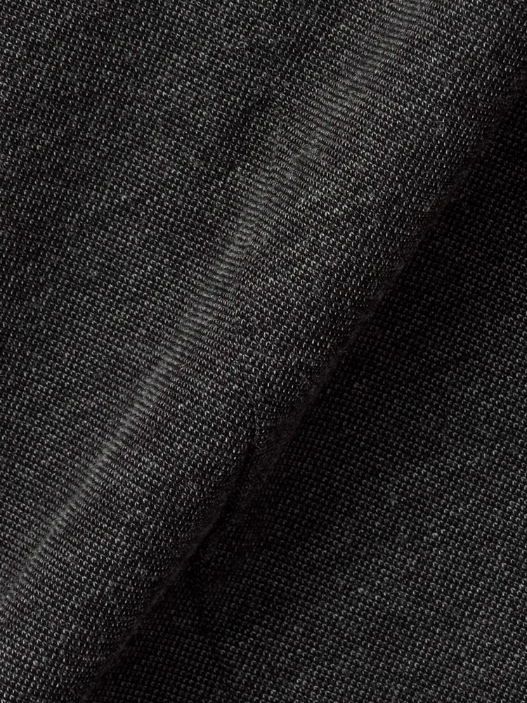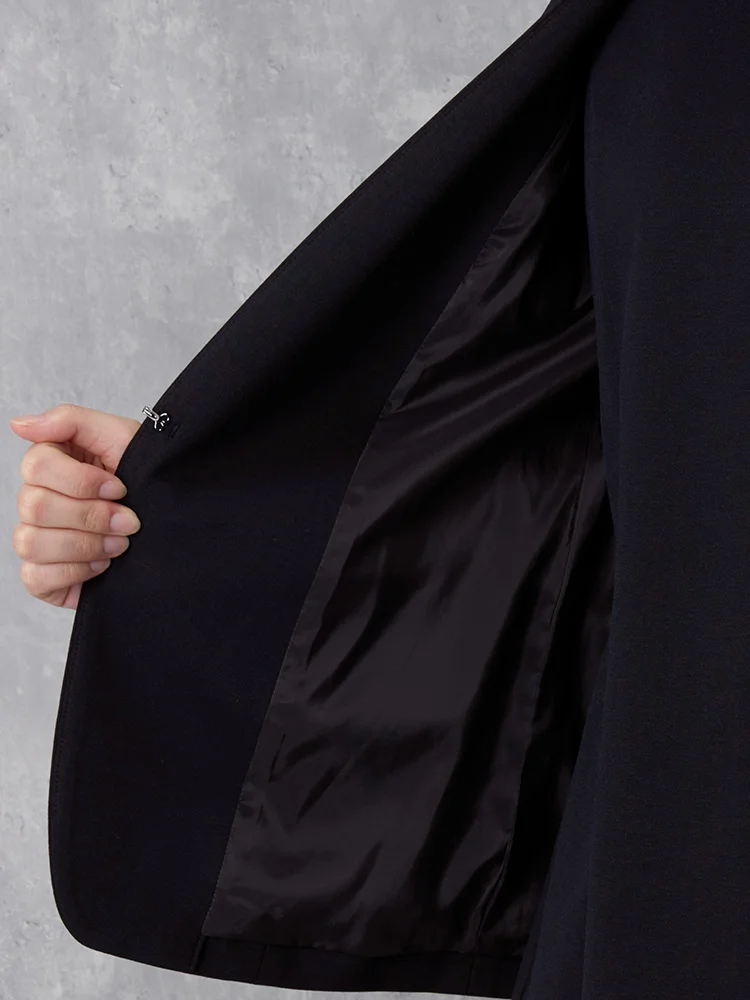 首に沿うようにやや立ち襟のシルエットなので、首回りからウェストにかけてV字ラインがよりすっきりとシャープに見えます。