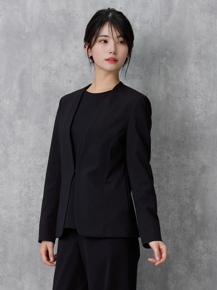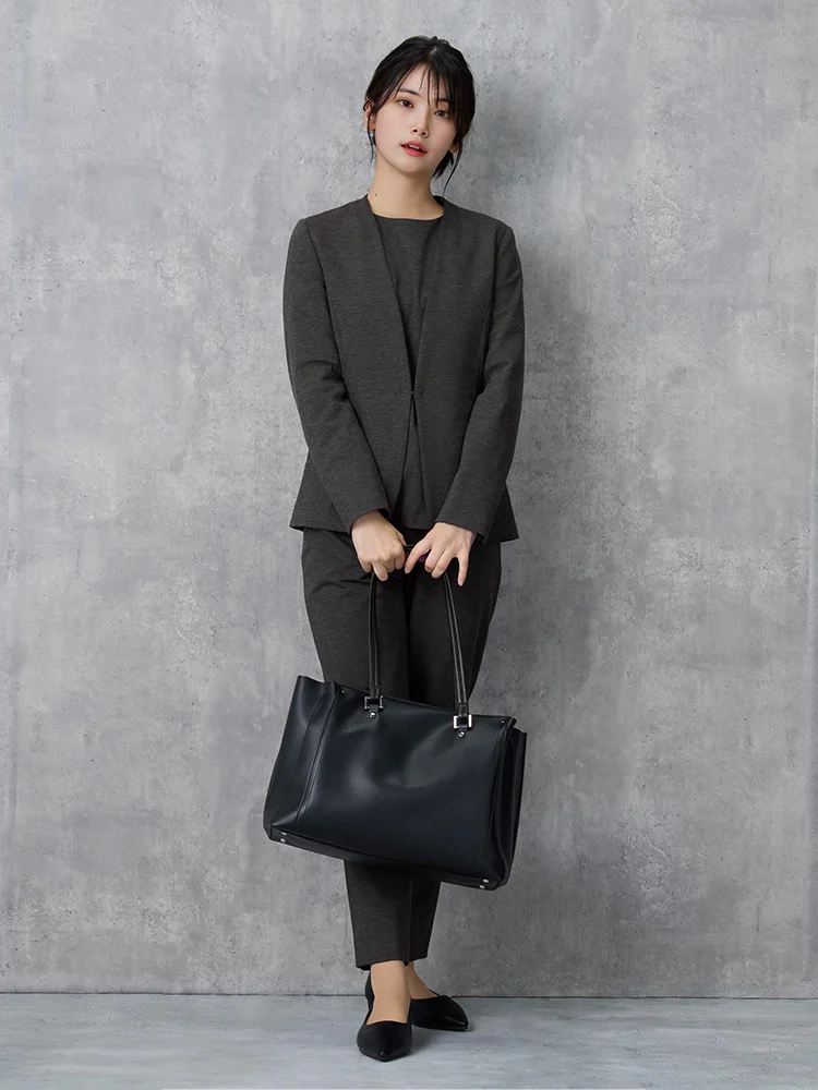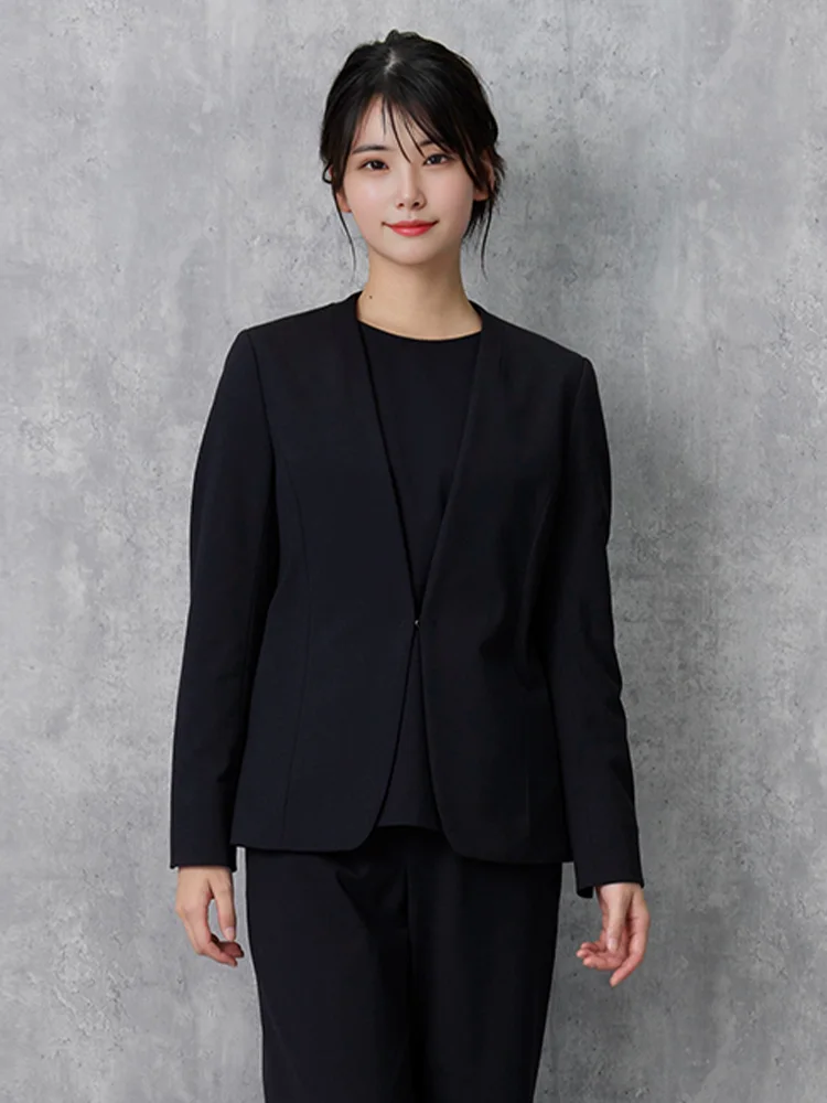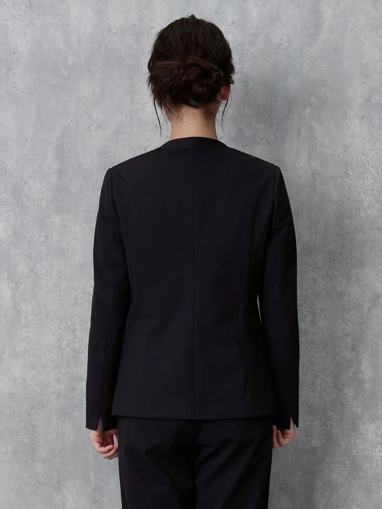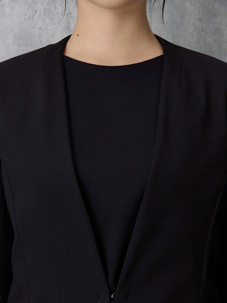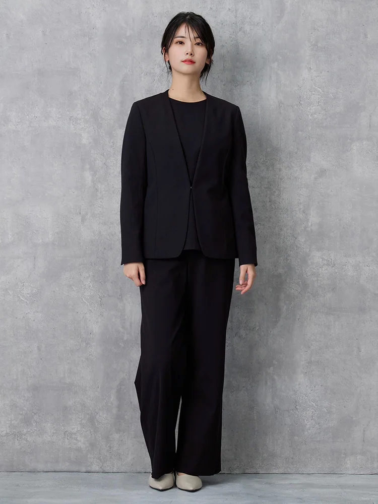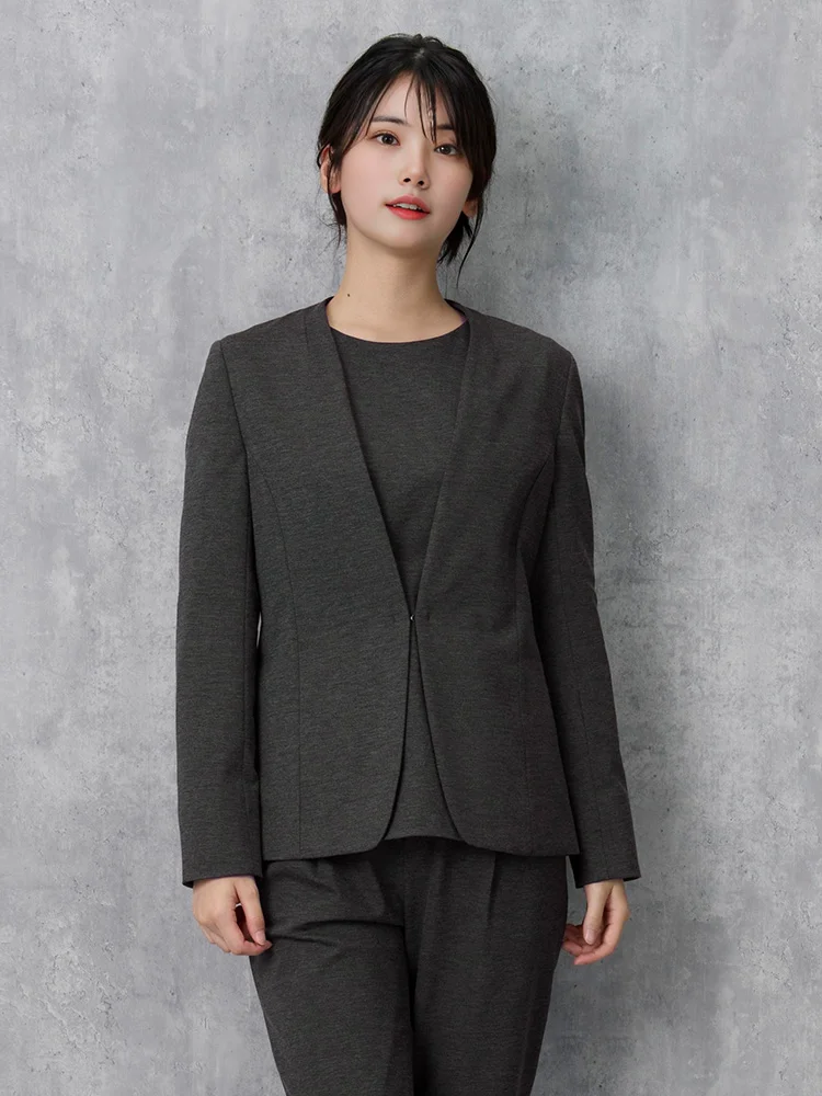 気軽に羽織れる襟なしタイプながら首にやや沿う襟ぐり、シャープなV字ラインできちんと感も合わせもつジャケットです。