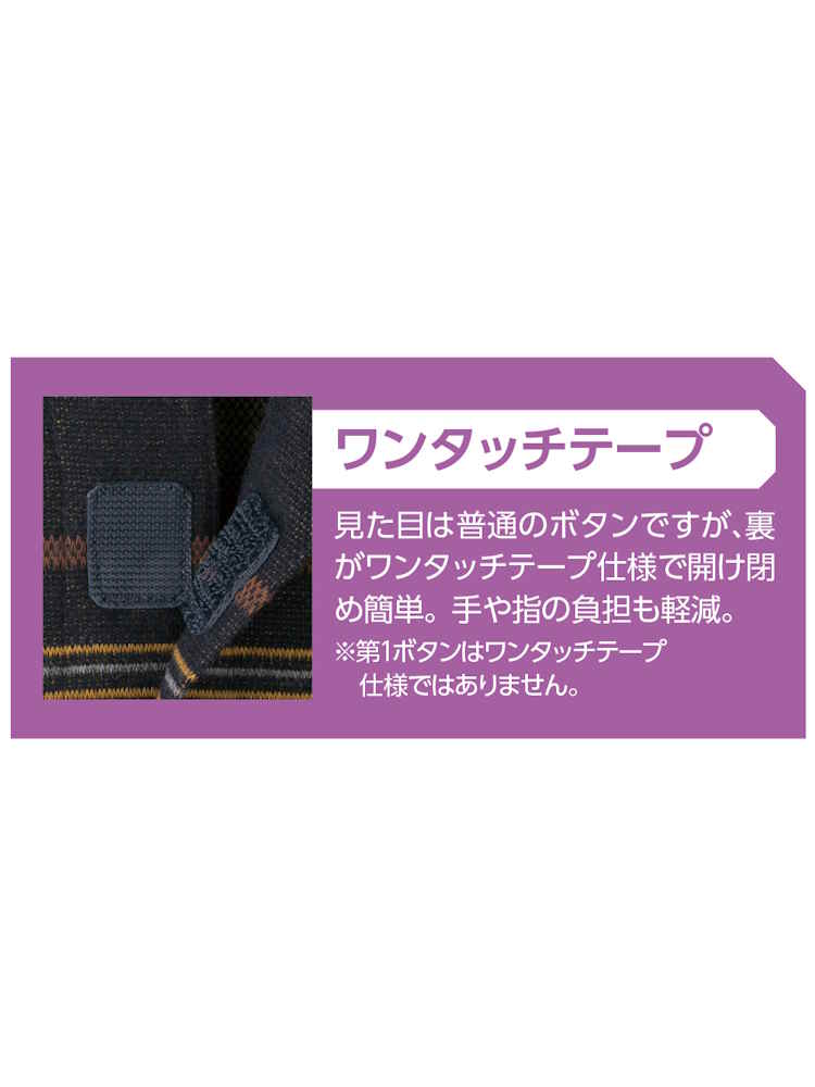 見た目は普通のボタンですが、裏がワンタッチテープ仕様で開け閉め簡単。手や指の負担も安全に軽減できます。