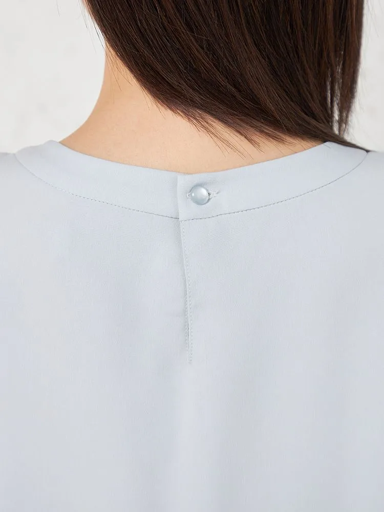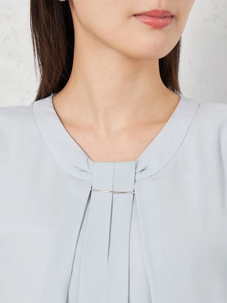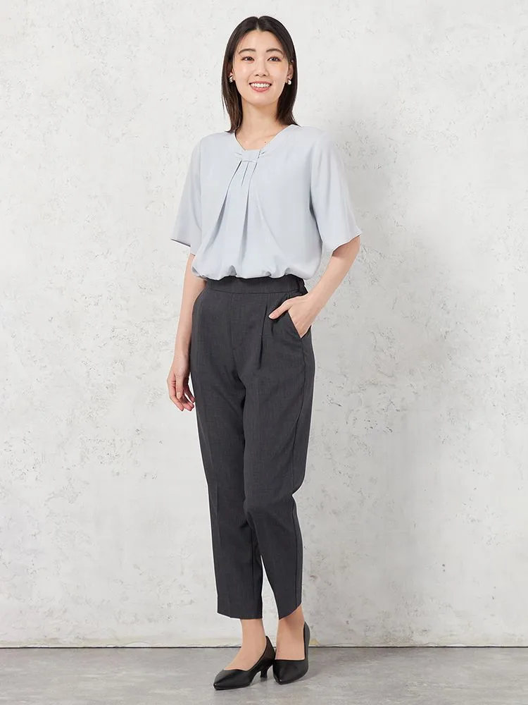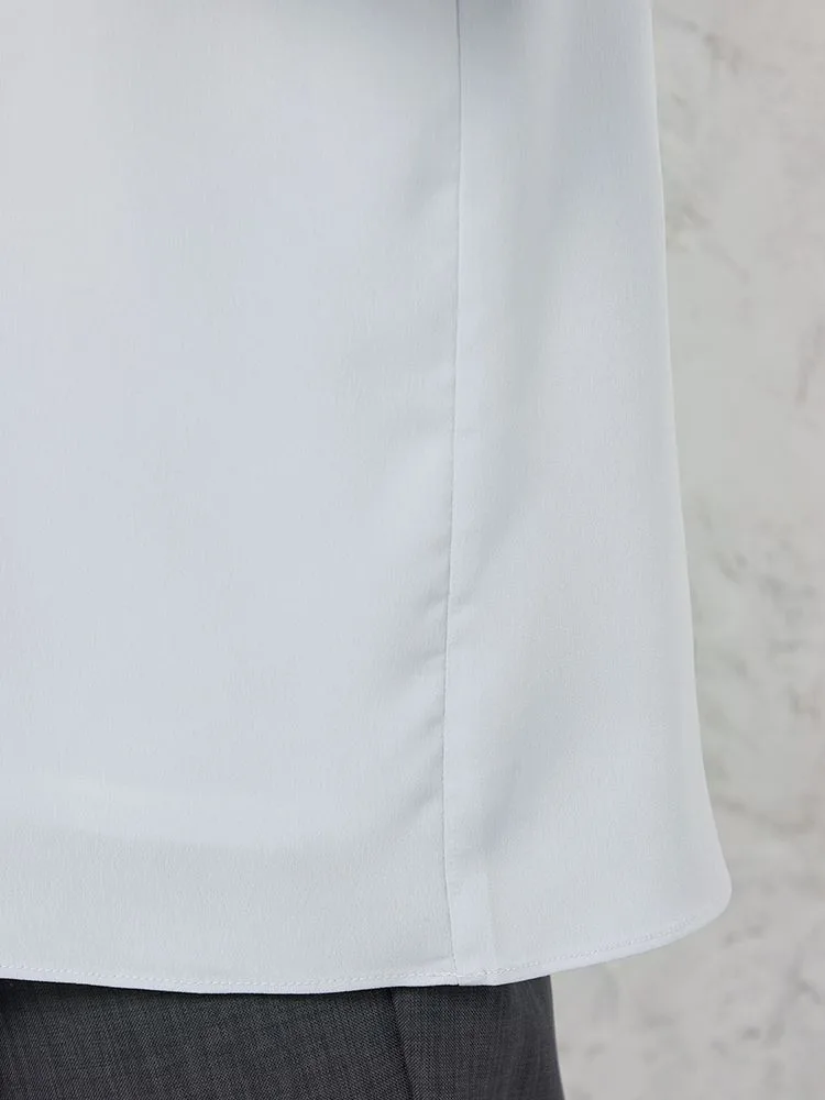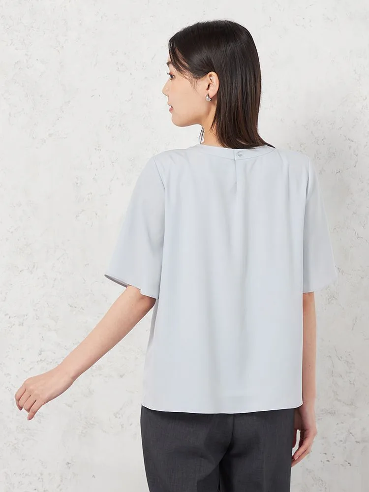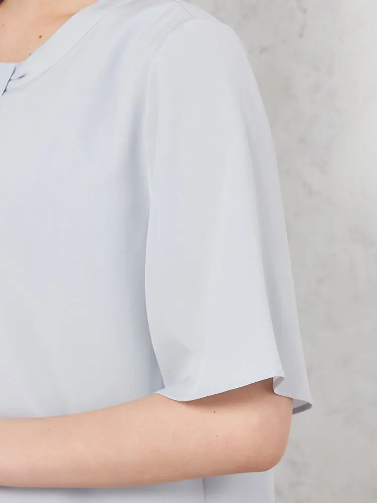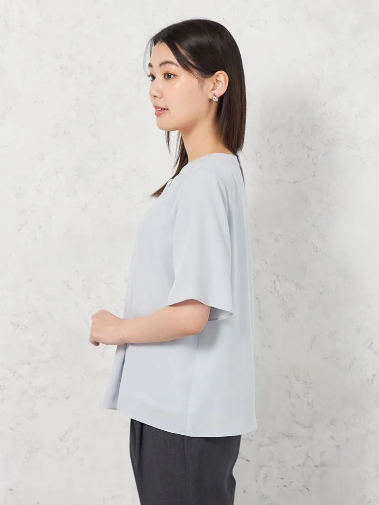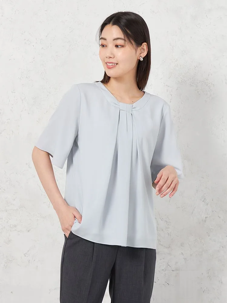 身頃2枚仕立てで1枚で着用しても下着が透けにくく、また、袖丈長めの5分袖でオフィスでも安心して着用できます。