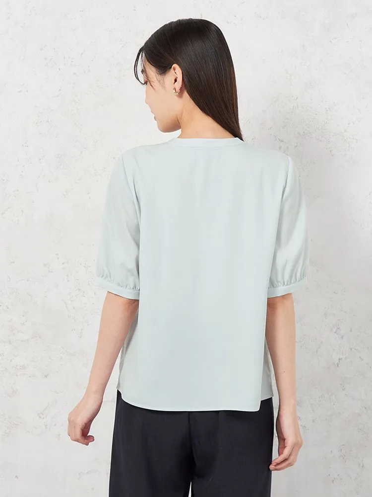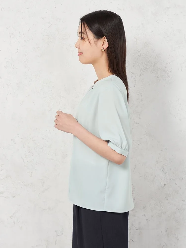 丸みのあるシルエットが優しい雰囲気のシンプルな5分袖のブラウスです。
