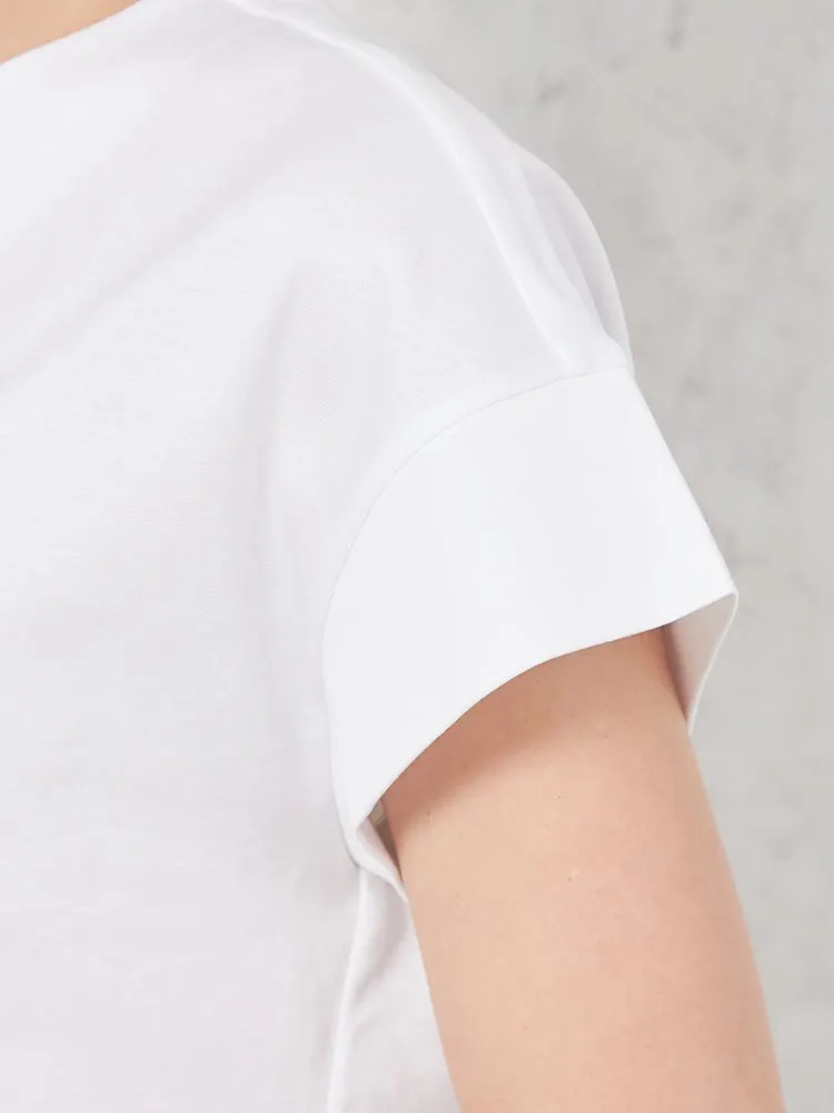 適度な肉感のポンチ素材で身体のラインを拾いにくく、またシルケット加工を施すことにより、滑らかな肌触りと上品な表面感に仕上がっています。