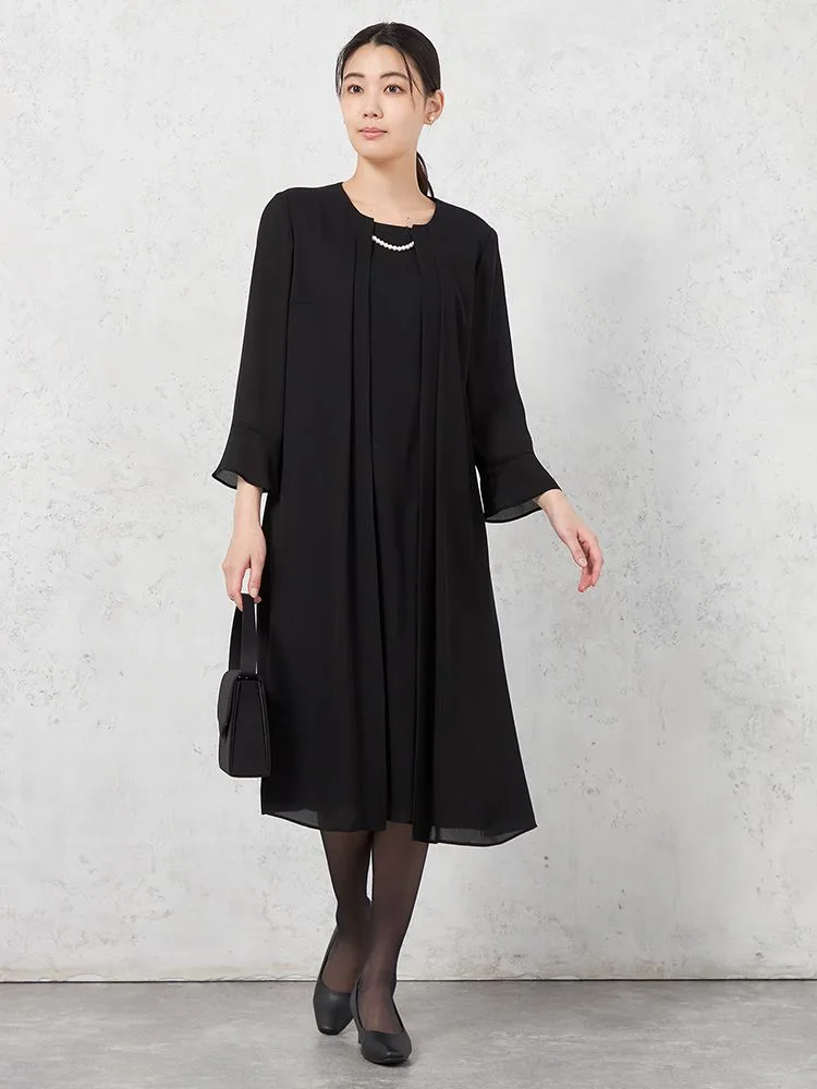 【上下ウォッシャブル】フォーマルアンサンブルボウタイ取り外し可ノーカラージャケット/ワンピース黒無地ViVi通年【レディース】