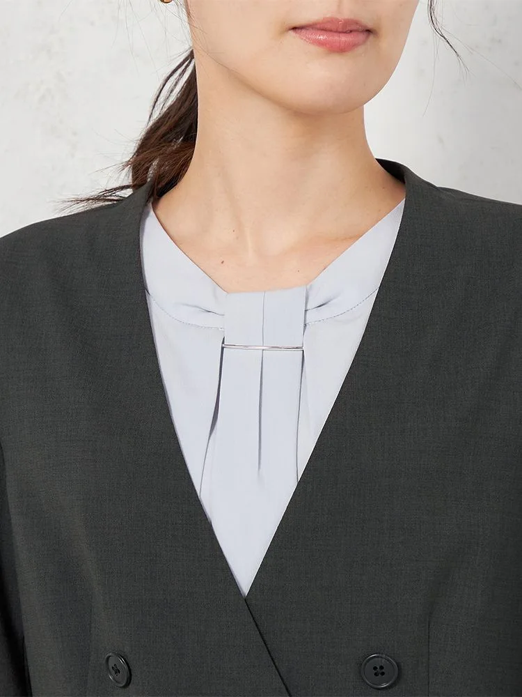 首元がすっきりとシャープなイメージのあるカラーレスのダブルジャケットは着心地の良いリラックスシルエット。