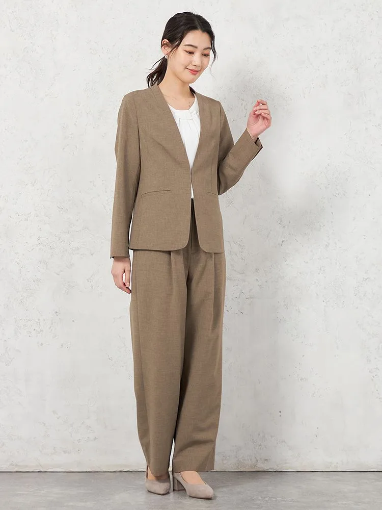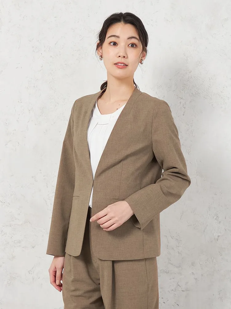 【ウォッシャブル】ノーカラージャケット リネンライクストレッチ UVカット SOFFICE 春夏【レディース】(ブラウン)