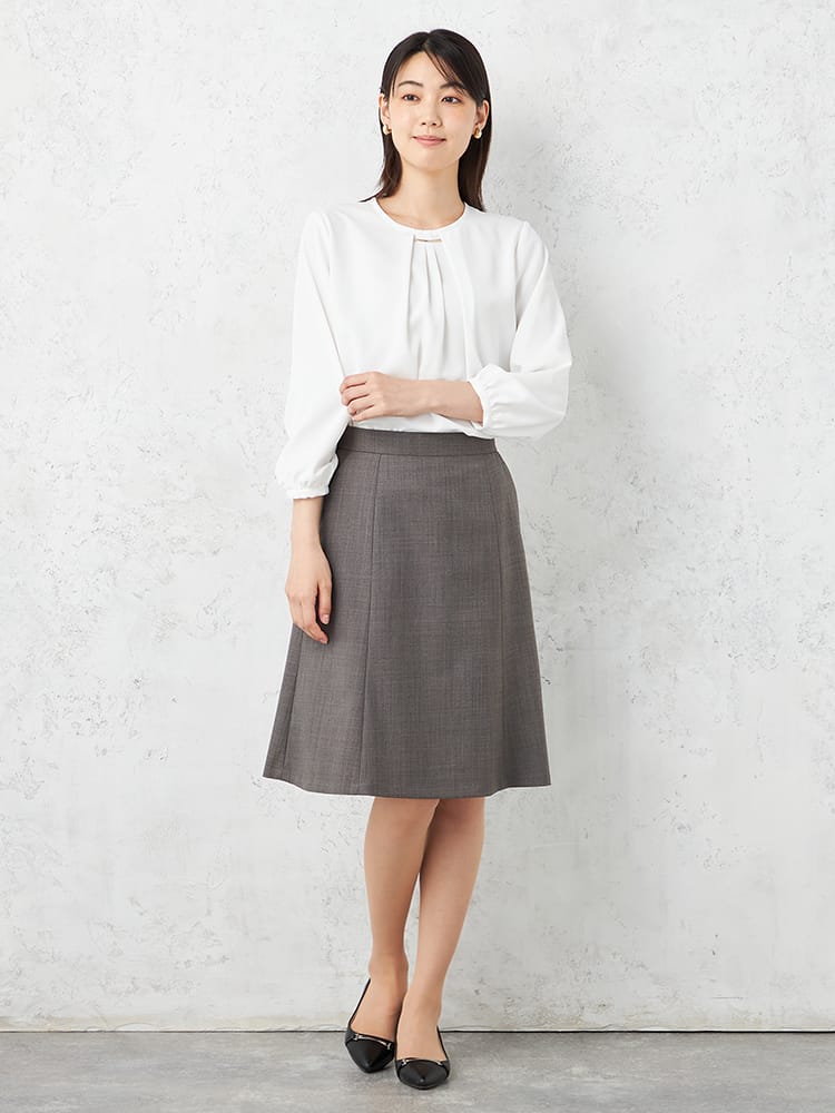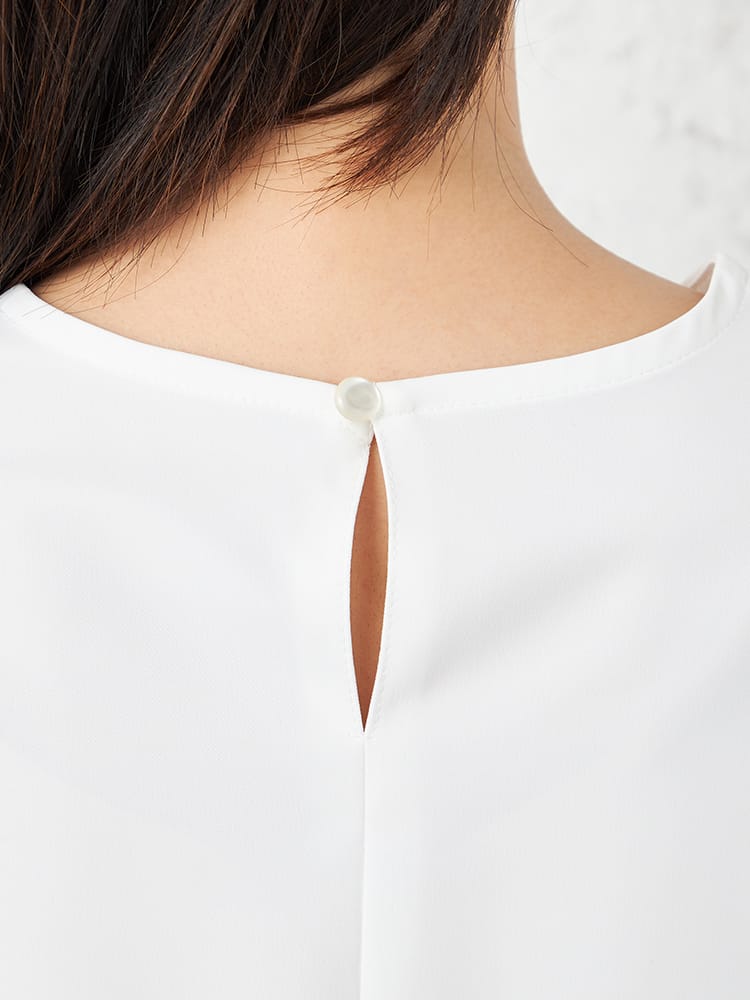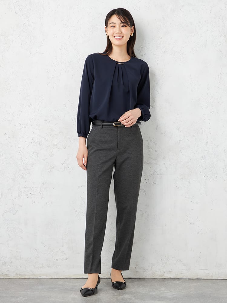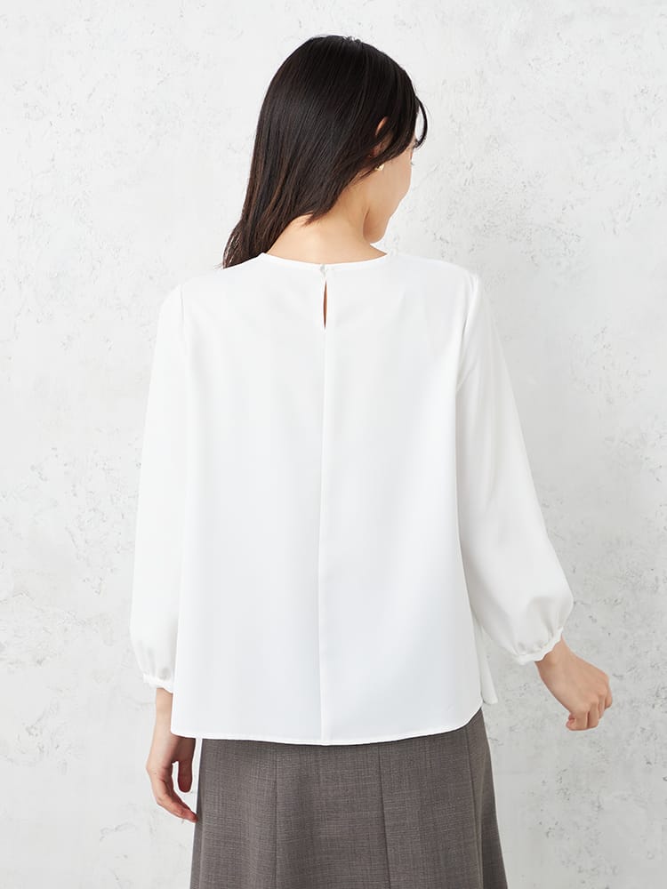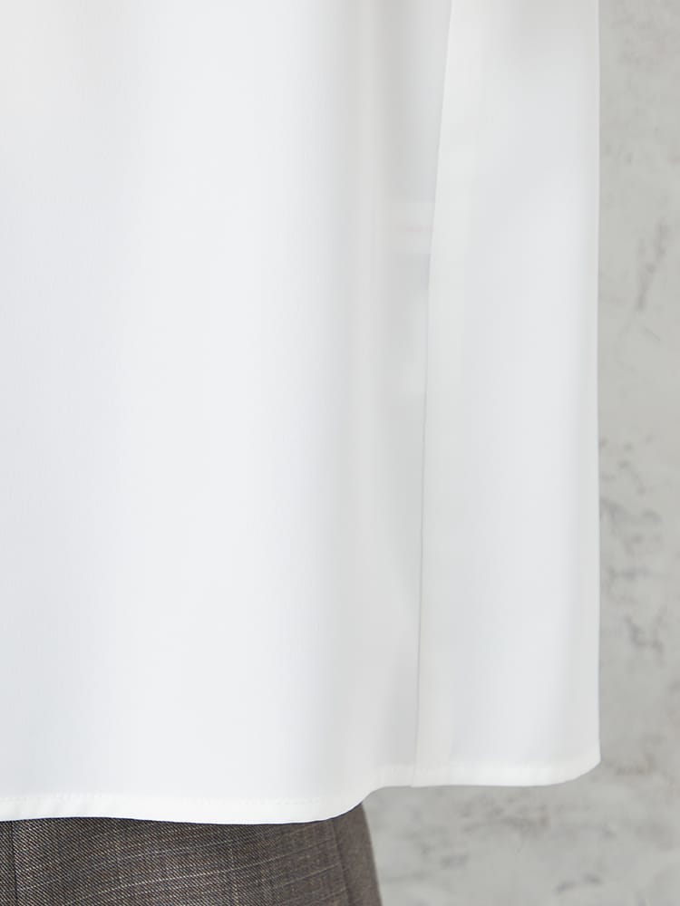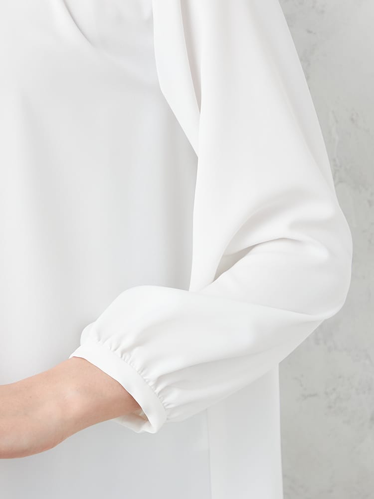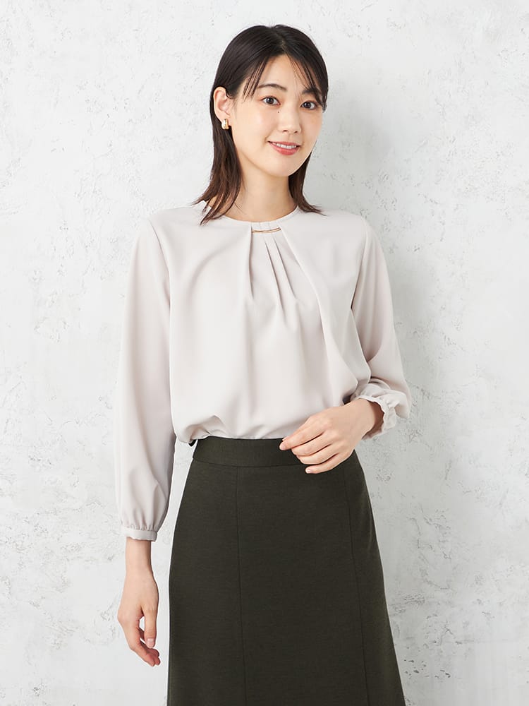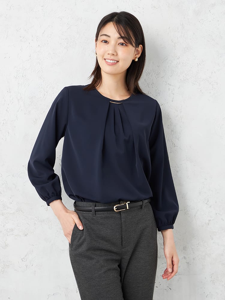 落ち感きれいなパウダーサテン生地の定番のでスタイリッシュなフロントタックブラウス。