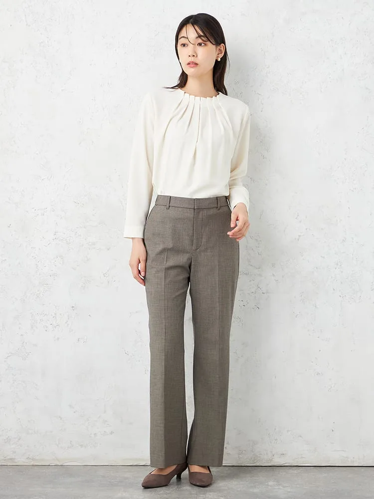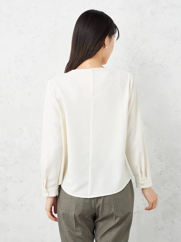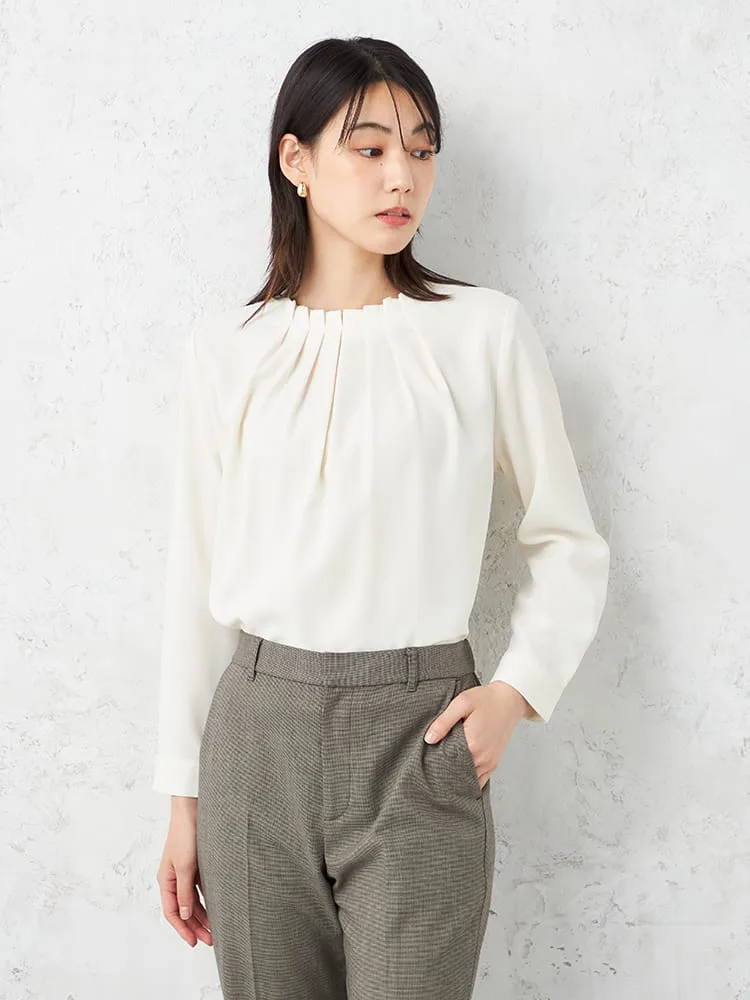 衿のタックデザインにこだわった主役級のブラウスで、ジャケットインはもちろん、1枚でも着映えします。