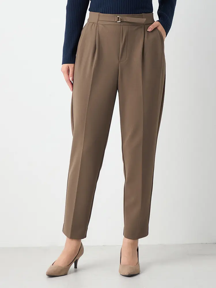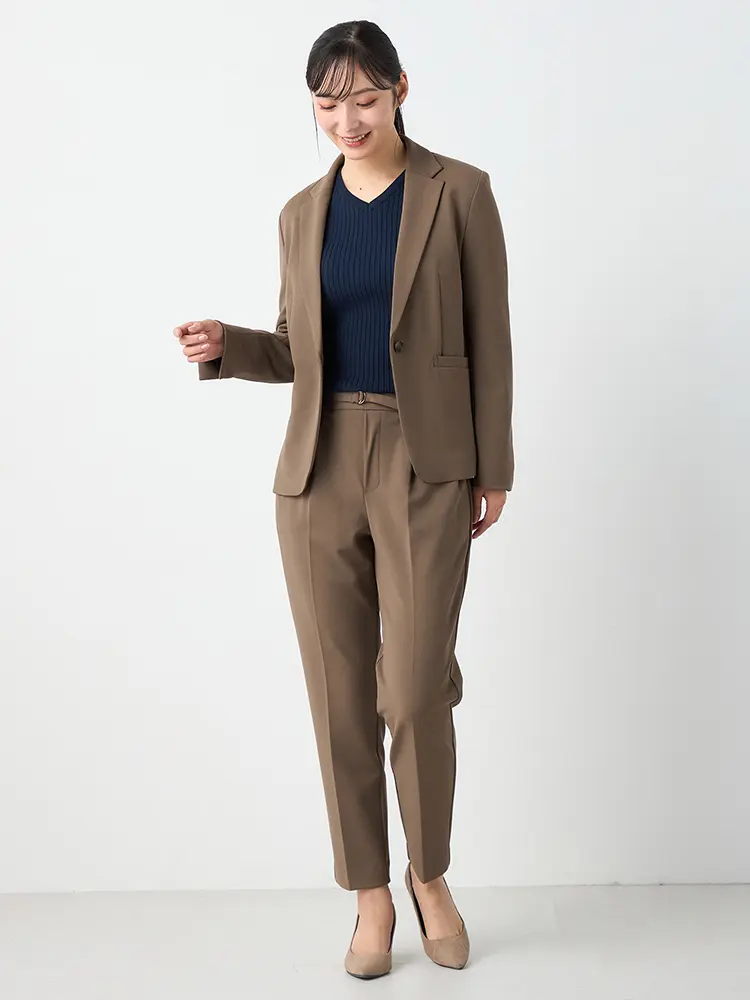 1つボタンのテーラードジャケットに、スマートなテーパードパンツを組み合わせました。