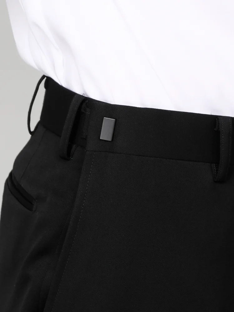 パンツの腰回りに生地の折り込みがなく、スッキリとしたシルエットを実現します。シンプルで洗練された印象を与え、すっきりとした着こなしが可能です。