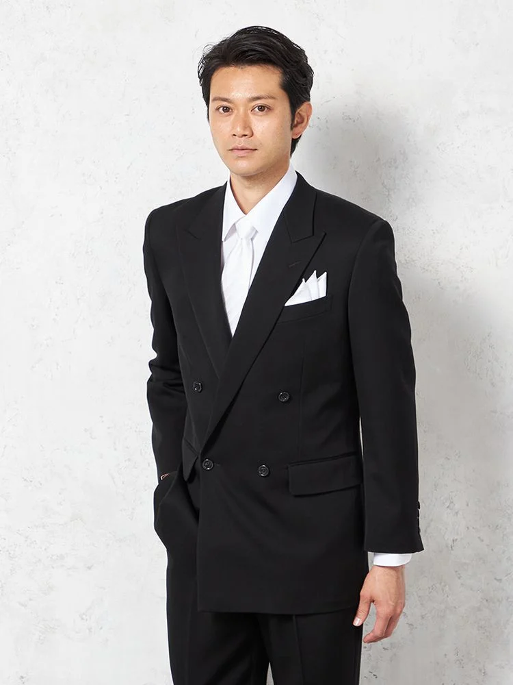 濃染加工に本台場など生地や仕立てにこだわった本格略礼服です。ワンタックのパンツにはウエストが調整できるアジャスター付です。