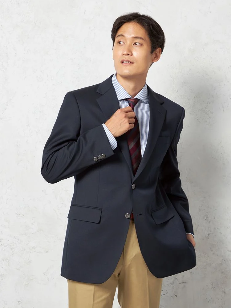 通年で着用できる生地を使用したベーシックなネイビーのジャケット。