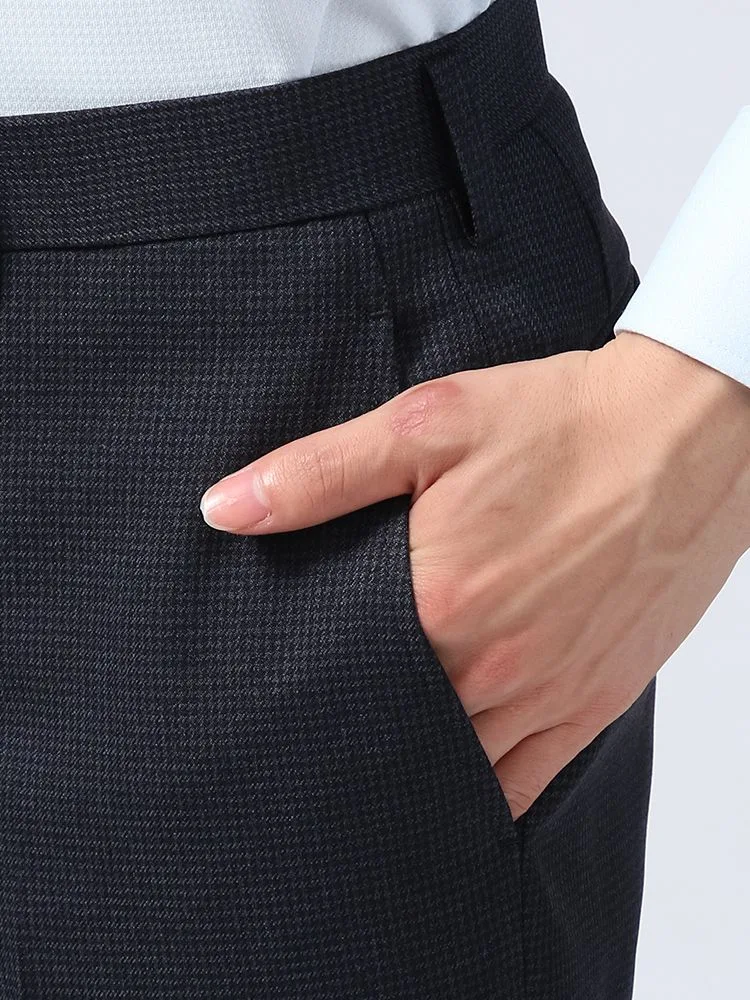 パンツの腰回りに生地の折り込みがなく、スッキリとしたシルエットを実現します。シンプルで洗練された印象を与え、すっきりとした着こなしが可能です。