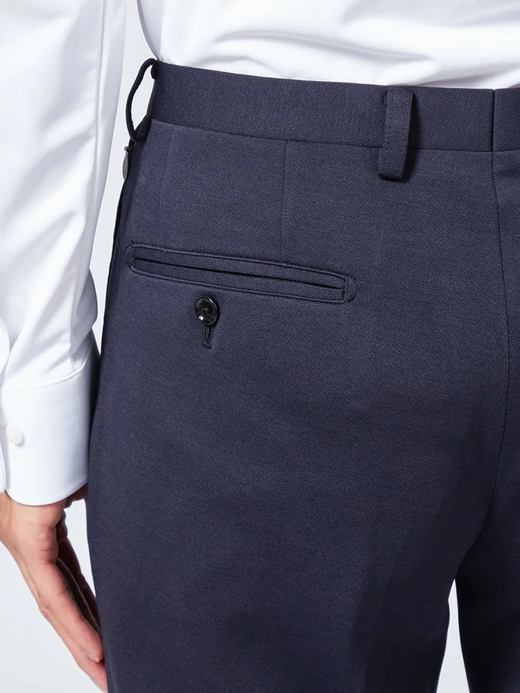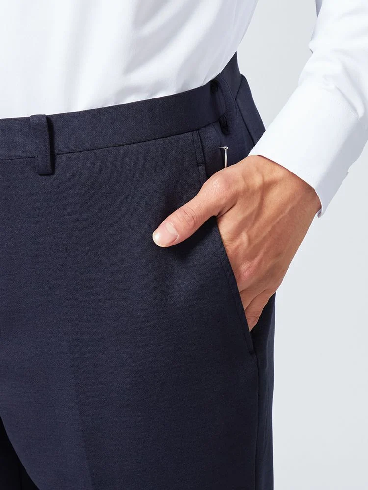 パンツの腰回りに生地の折り込みがなく、スッキリとしたシルエットを実現します。シンプルで洗練された印象を与え、すっきりとした着こなしが可能です。