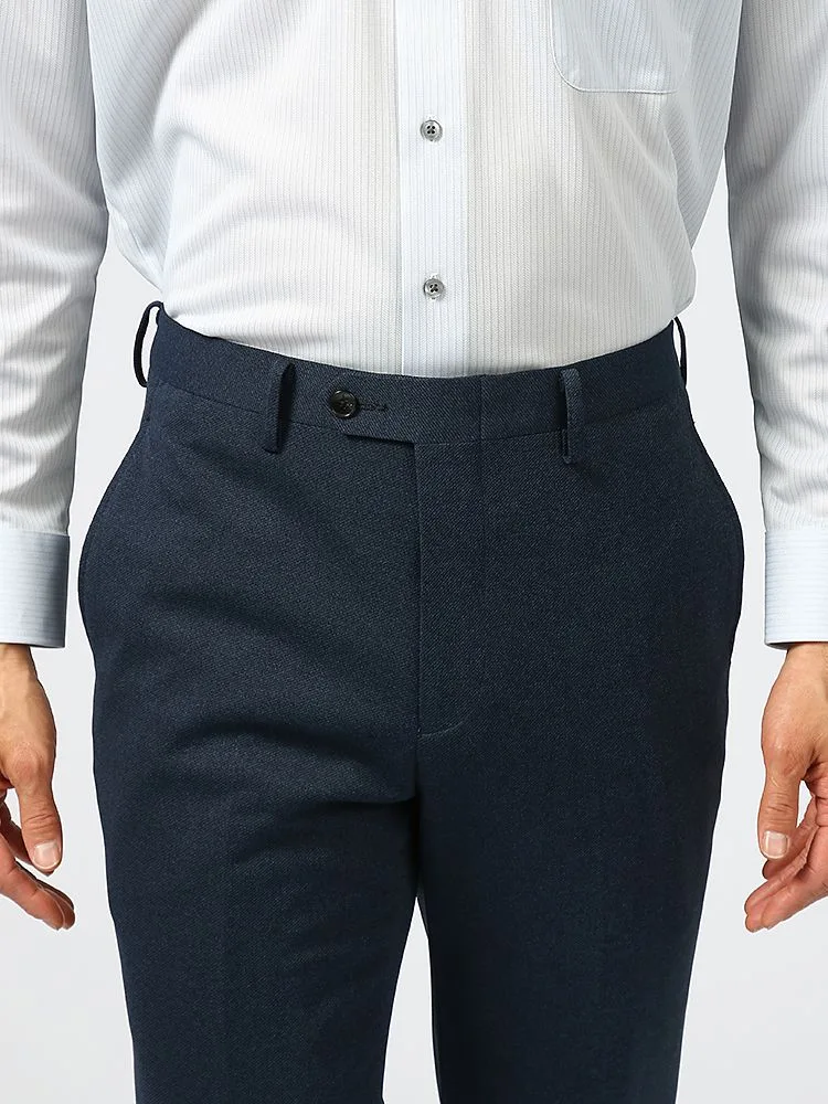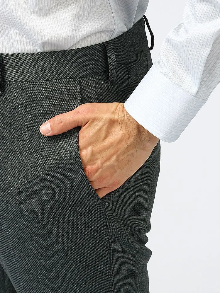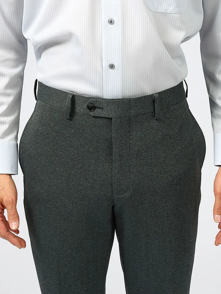 パンツの腰回りに生地の折り込みがなく、スッキリとしたシルエットを実現します。シンプルで洗練された印象を与え、すっきりとした着こなしが可能です。