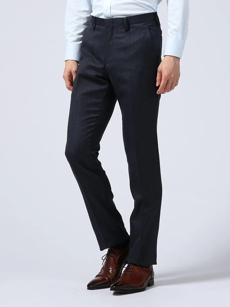 スッキリとした細身のシルエットとネイビーカラーで都会的で若々しい印象に着こなせるノータックパンツです。