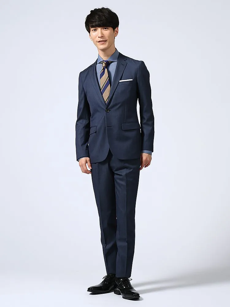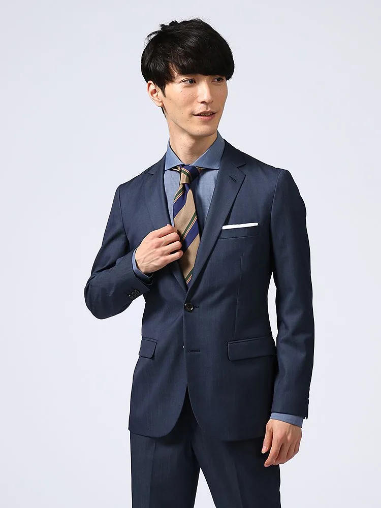 デニムライクな生地がスタイリッシュな上下セットスーツ。