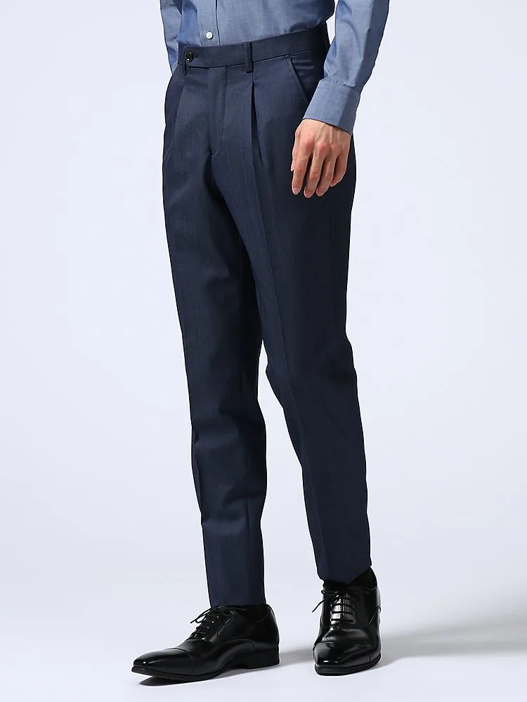 表地と背裏裏地はストレッチ素材で快適な着心地。立体感あるワンタック入りパンツは、シリコンファスナーと股シック付き。