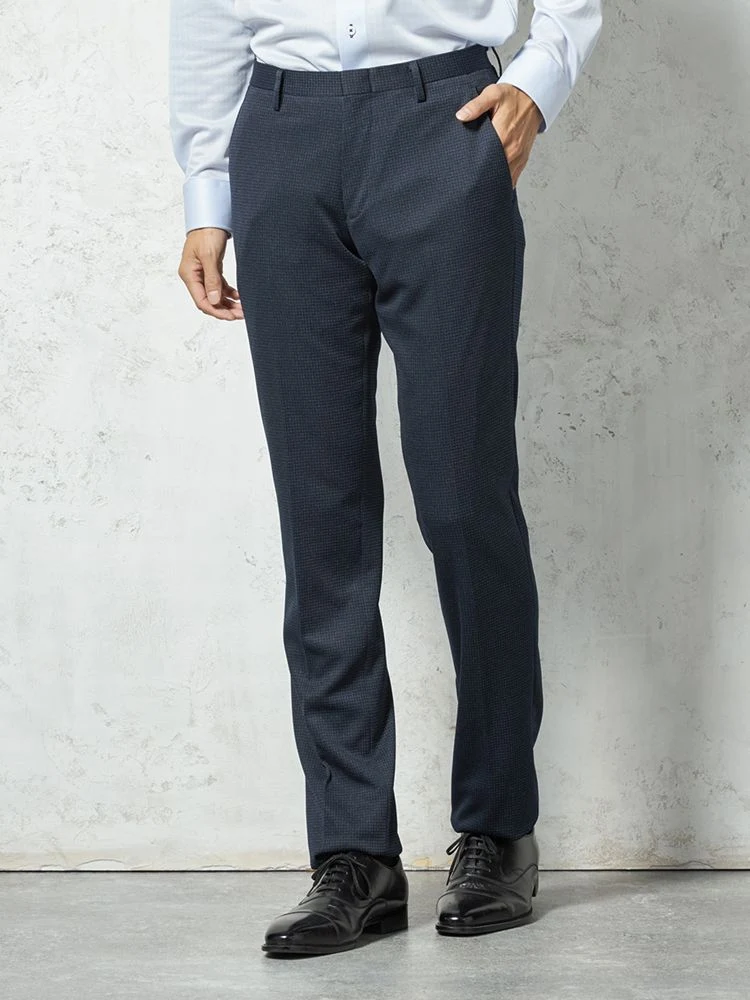 無地に近い感覚で取り入れやすい、細やかな千鳥格子柄のスラックス。