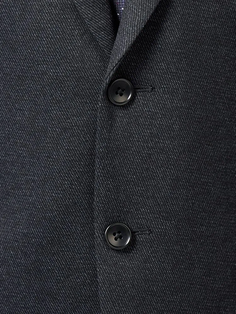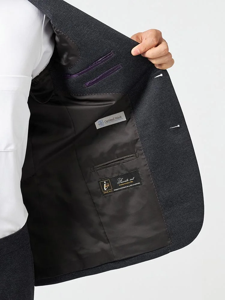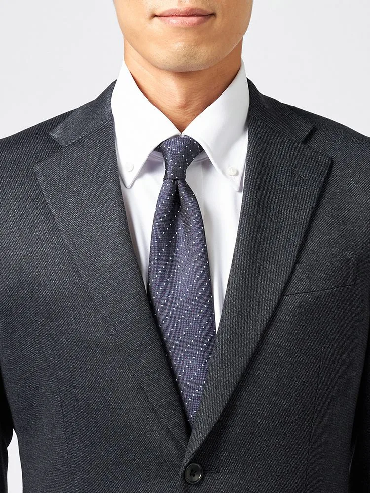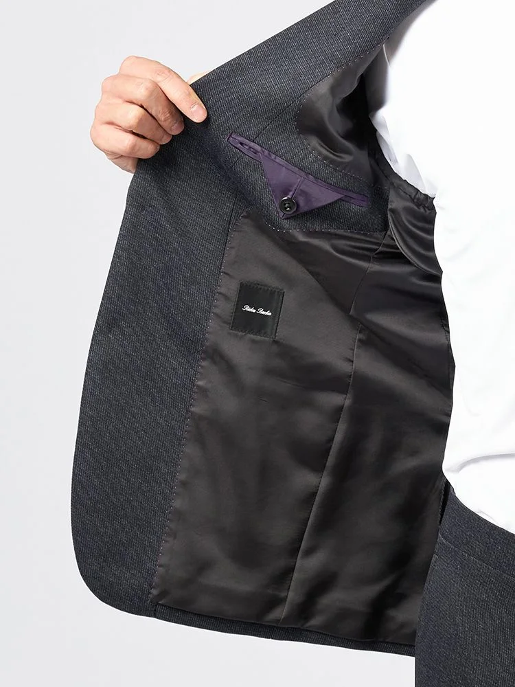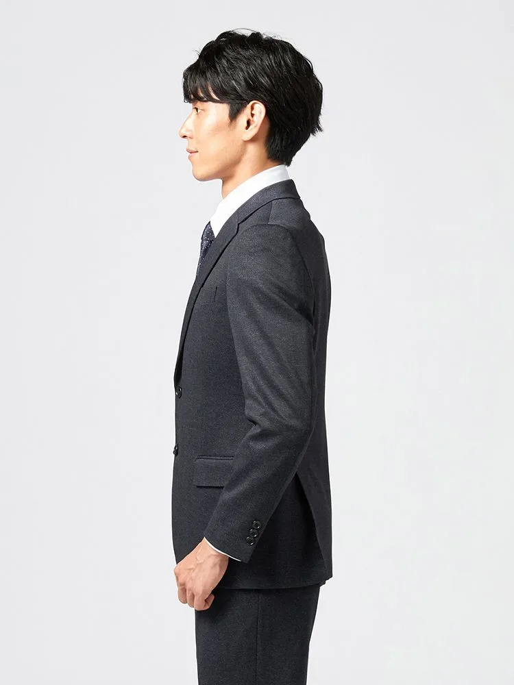 リサイクルポリエステル混の360度ストレッチニットを使用した2つボタンスーツです。