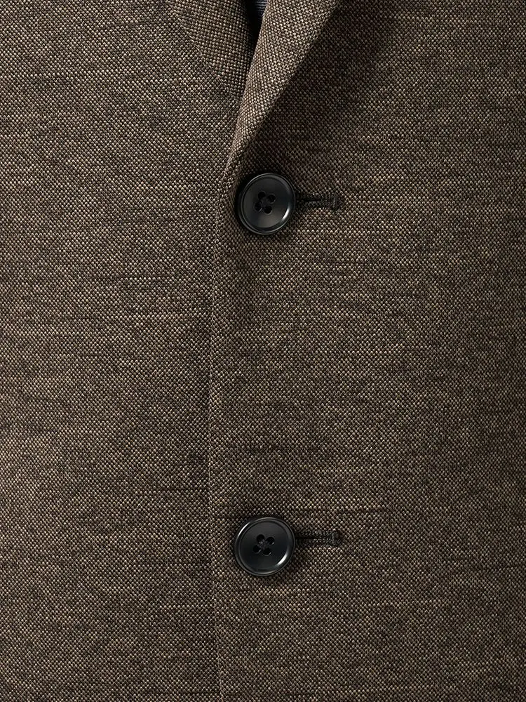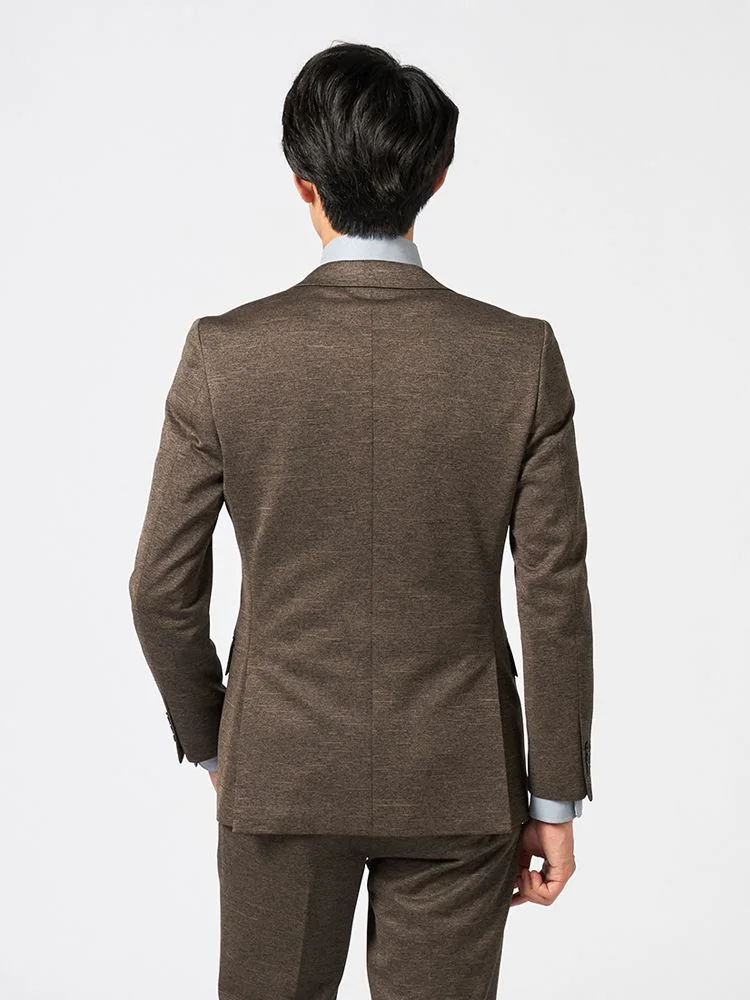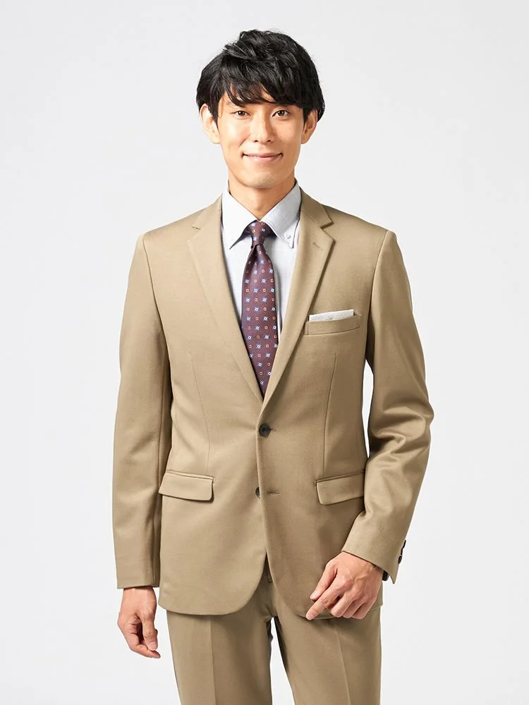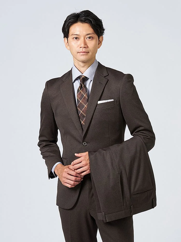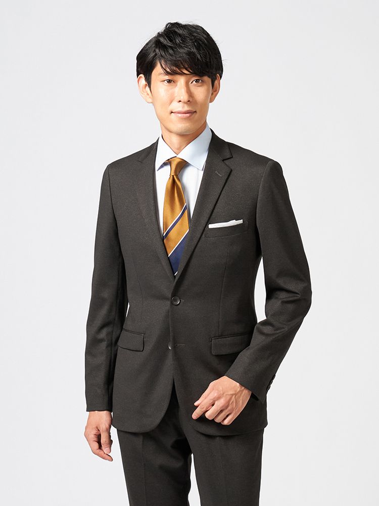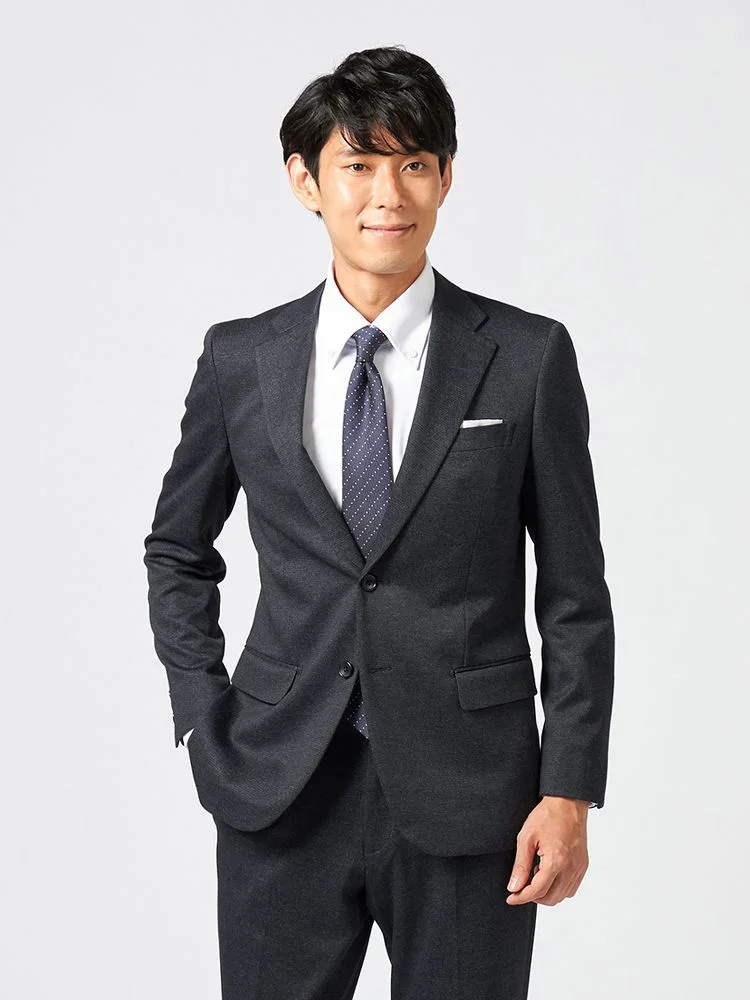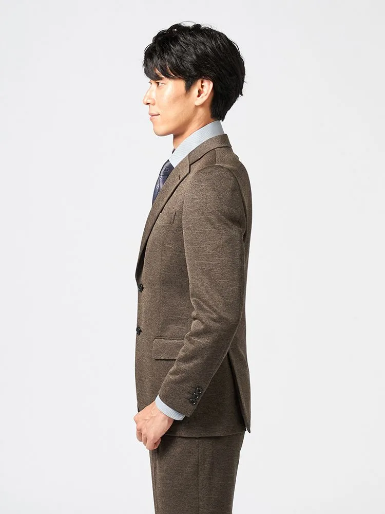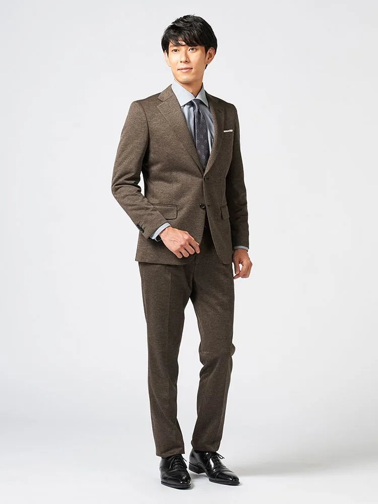リサイクルポリエステル混の360度ストレッチニットを使用した2つボタンスーツです。