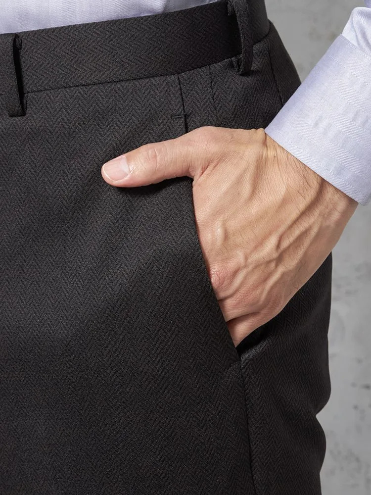パンツの腰回りに生地の折り込みがなく、スッキリとしたシルエットを実現します。シンプルで洗練された印象を与え、すっきりとした着こなしが可能です。