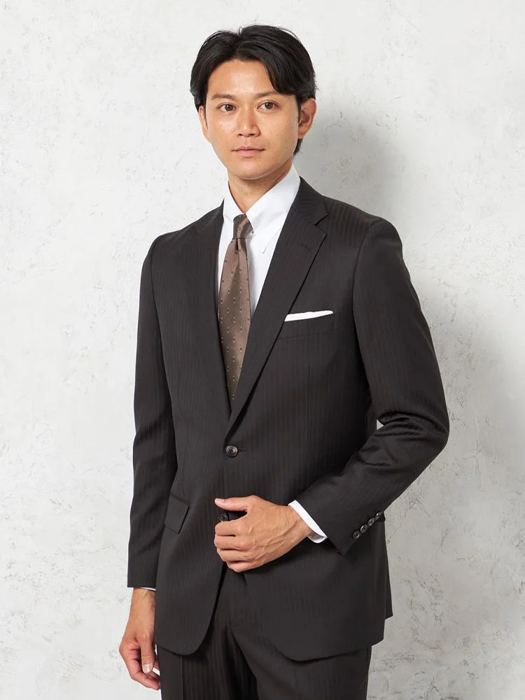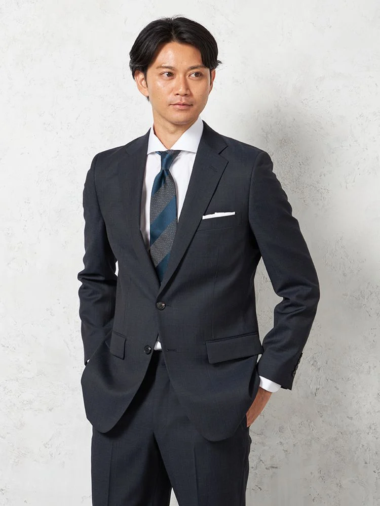 尾州産、英国羊毛&ションヘル(低速織)こだわりのプレミアム素材の高級感あふれる2つボタンスーツ。