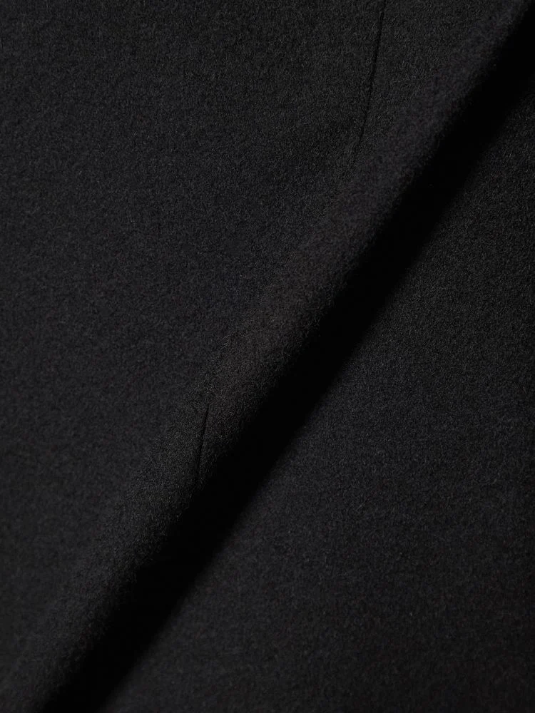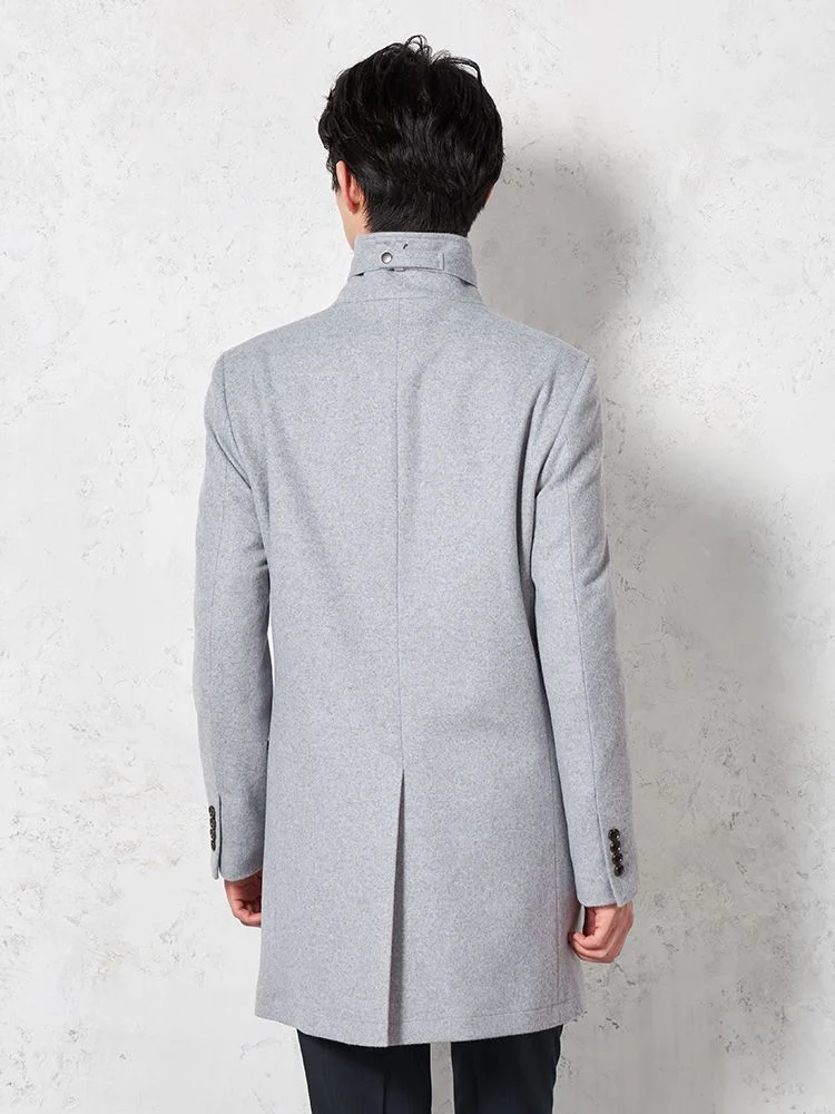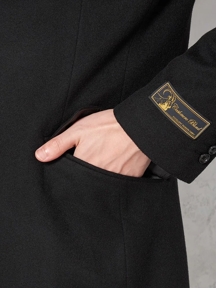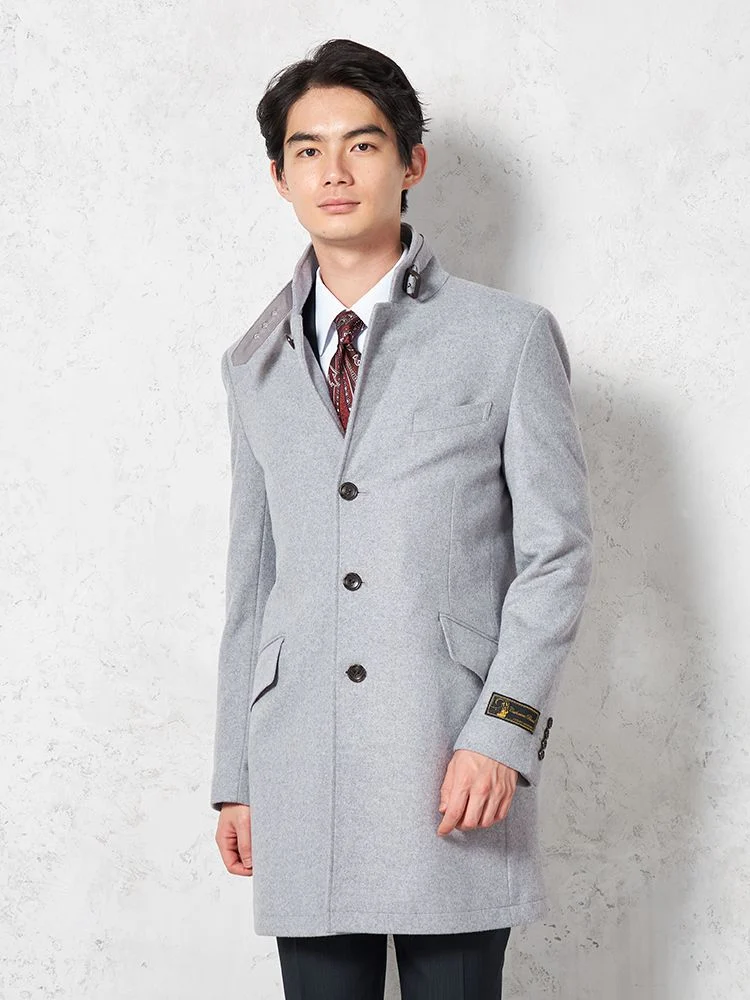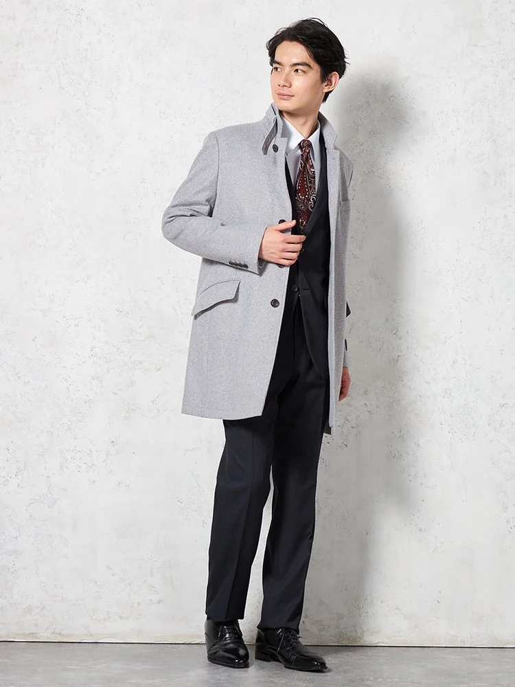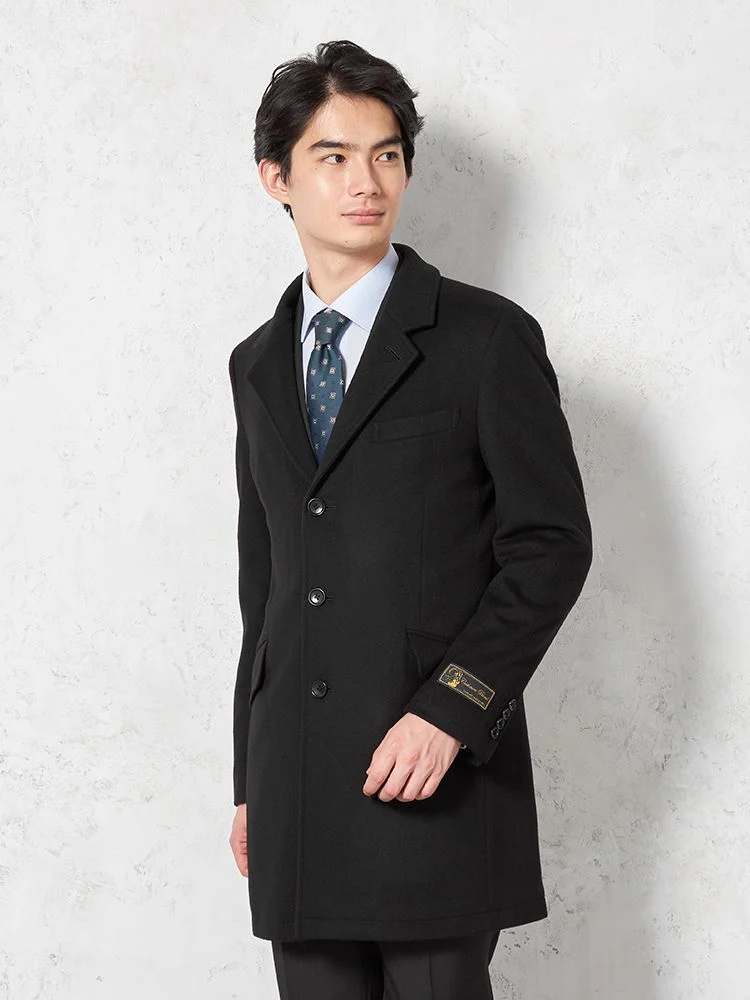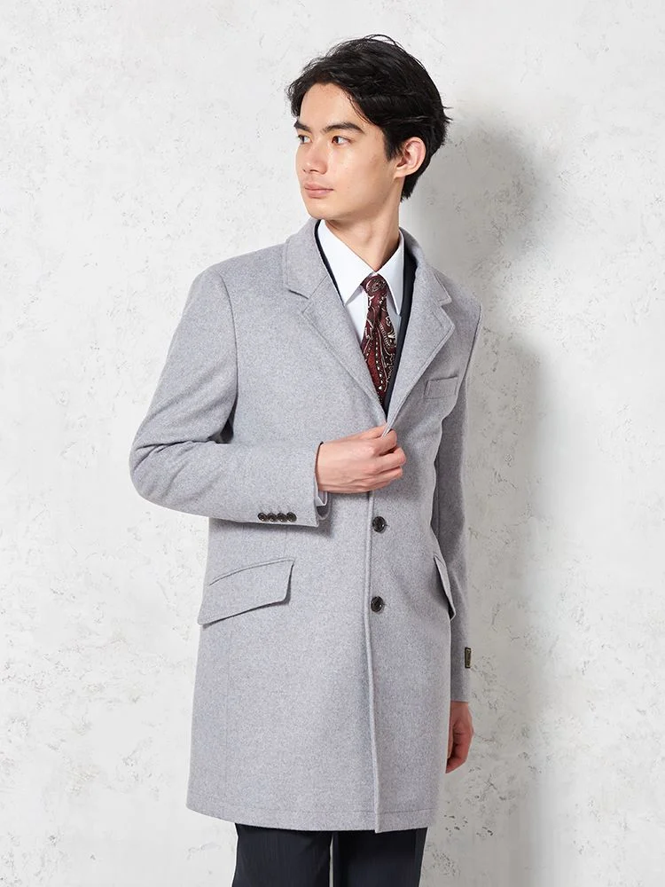 ウールとカシミアを混紡した、エレガントな風合いが際立つチェスターコート。