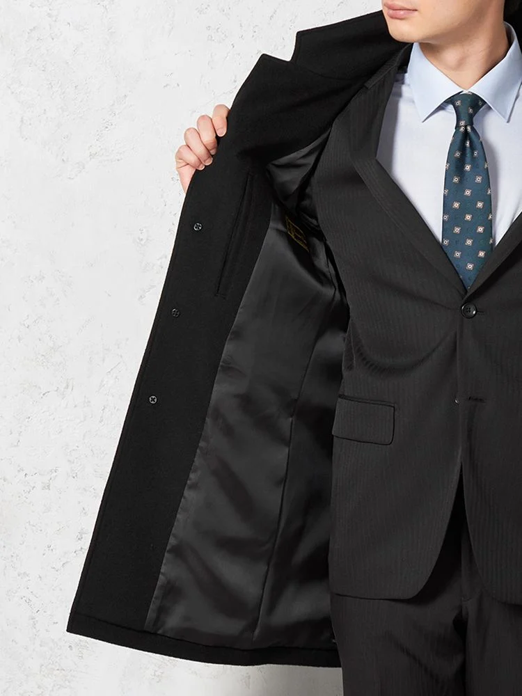 【撥水加工】コートセミトレンチ表地ストレッチ防風ライナー付き織柄無地nero秋冬