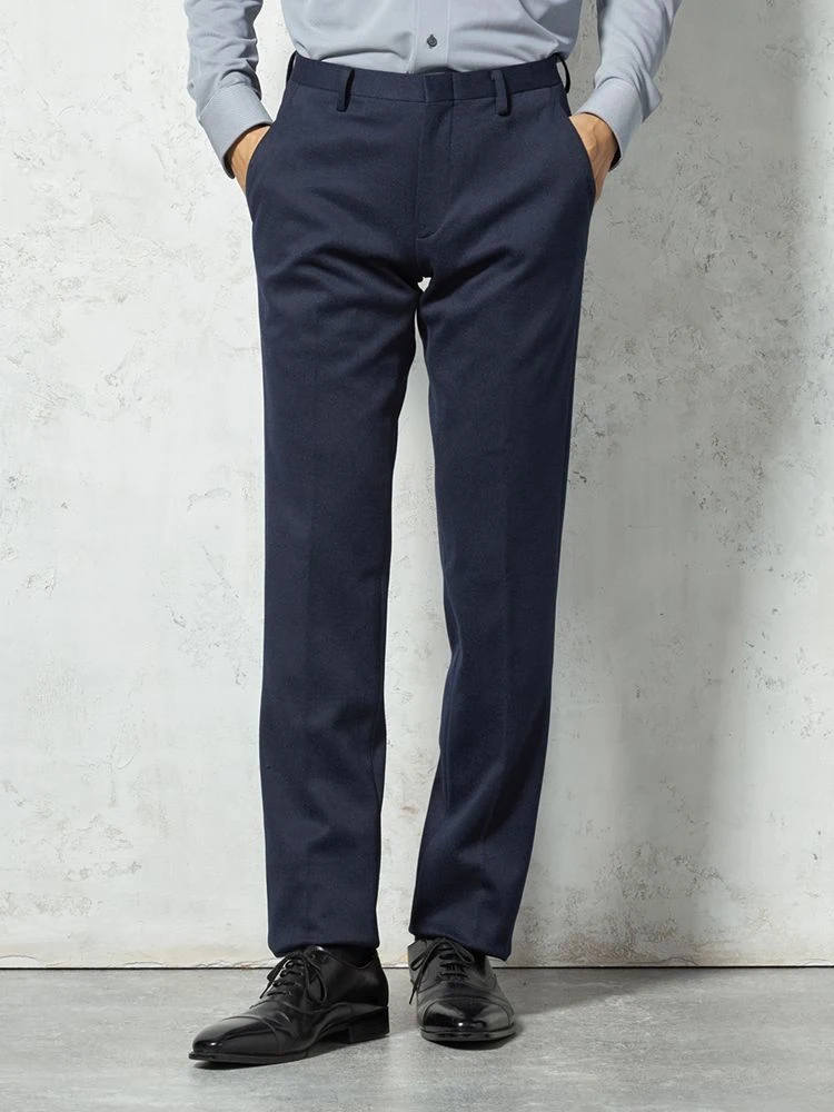 パンツの腰回りに生地の折り込みがなく、スッキリとしたシルエットを実現します。シンプルで洗練された印象を与え、すっきりとした着こなしが可能です。