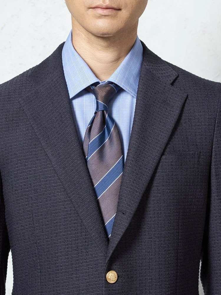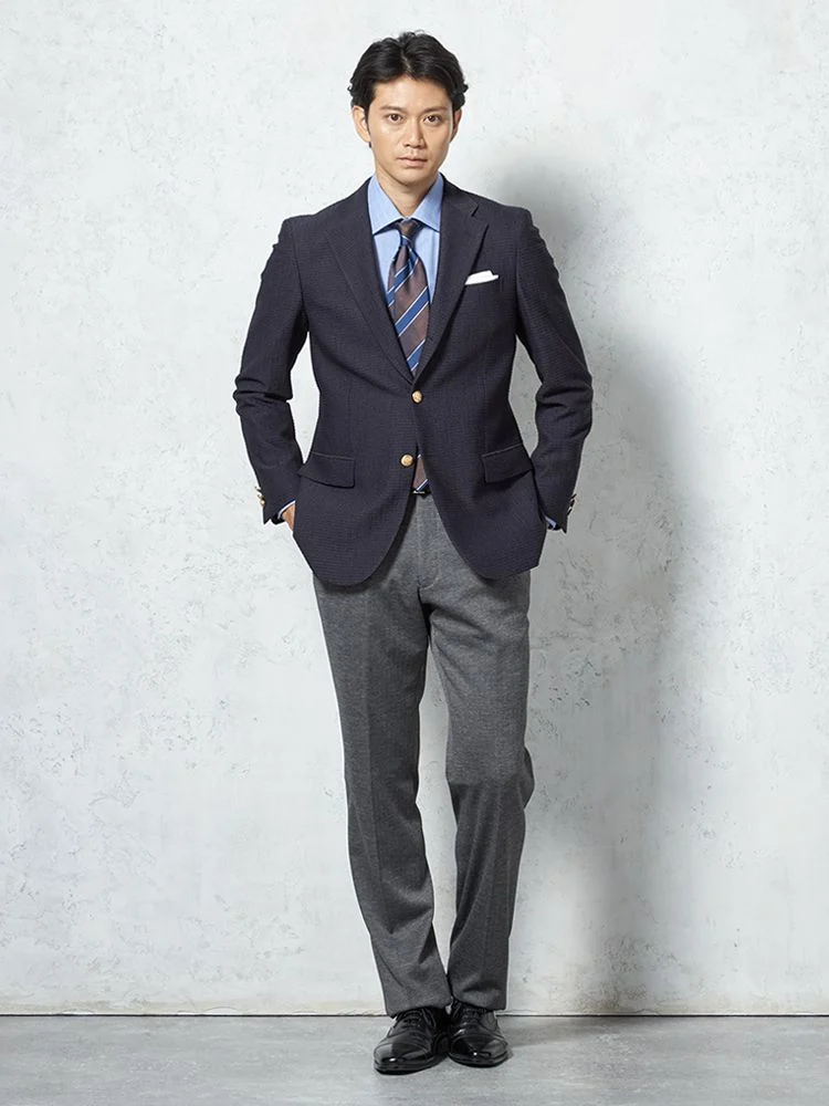 定番のネイビーカラーでネクタイとあわせるのはもちろん、手持ちのセーターをあわせたウォームビススタイルにもぴったりです。