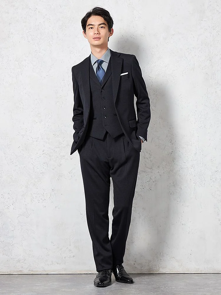 ジャケット、パンツ、ベストの3点セットで、スーツ全体を簡単にコーディネートできます。ビジネスやフォーマルな場面に最適です。