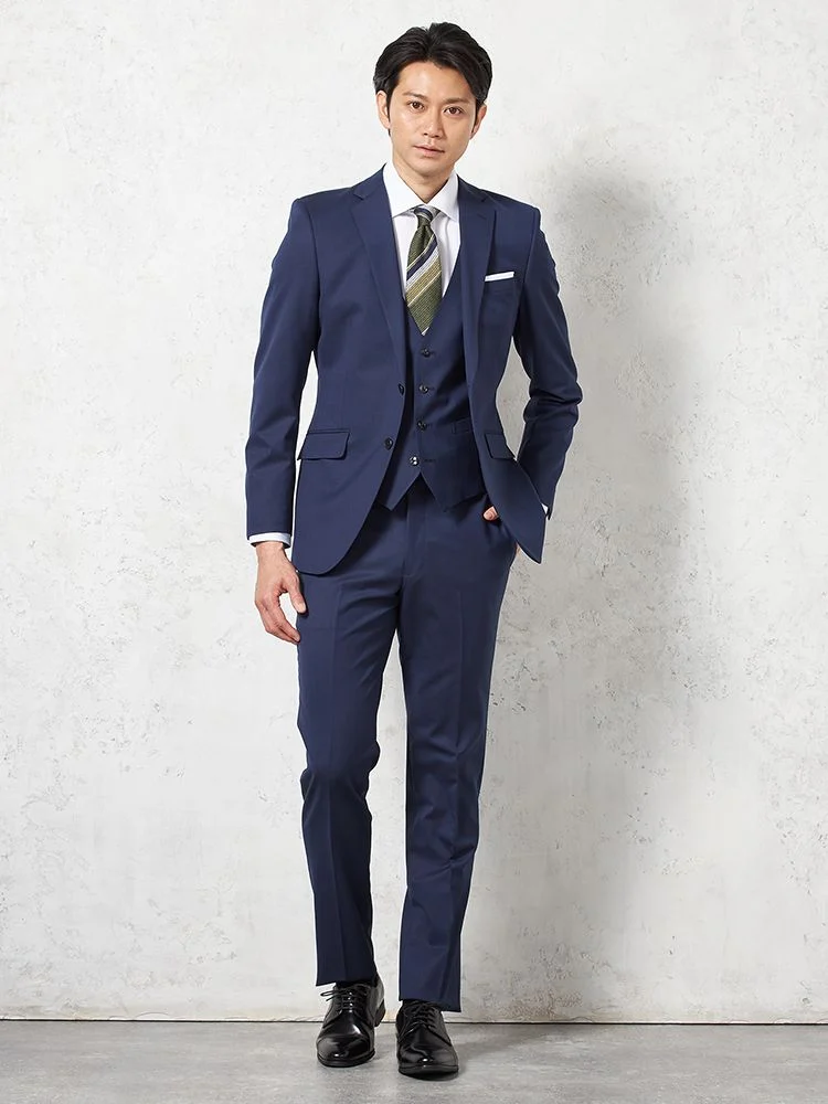 【パンツウォッシャブル】スリーピーススーツ2つボタンストレッチノータック無地S&MBLUELABEL